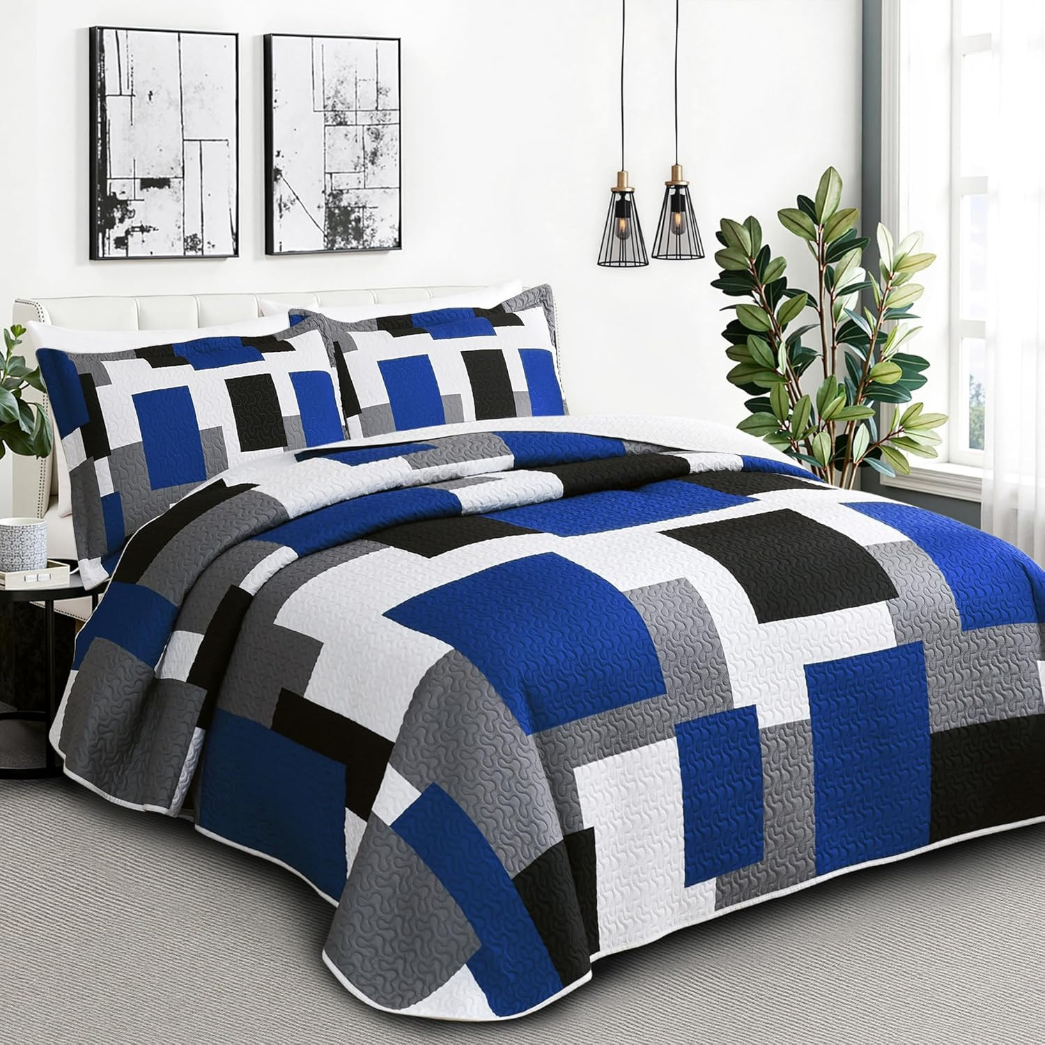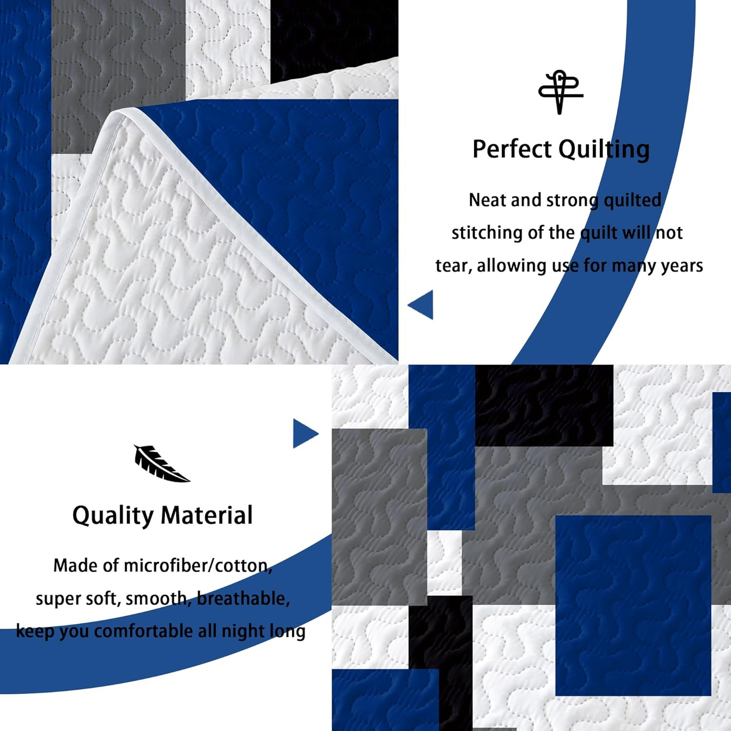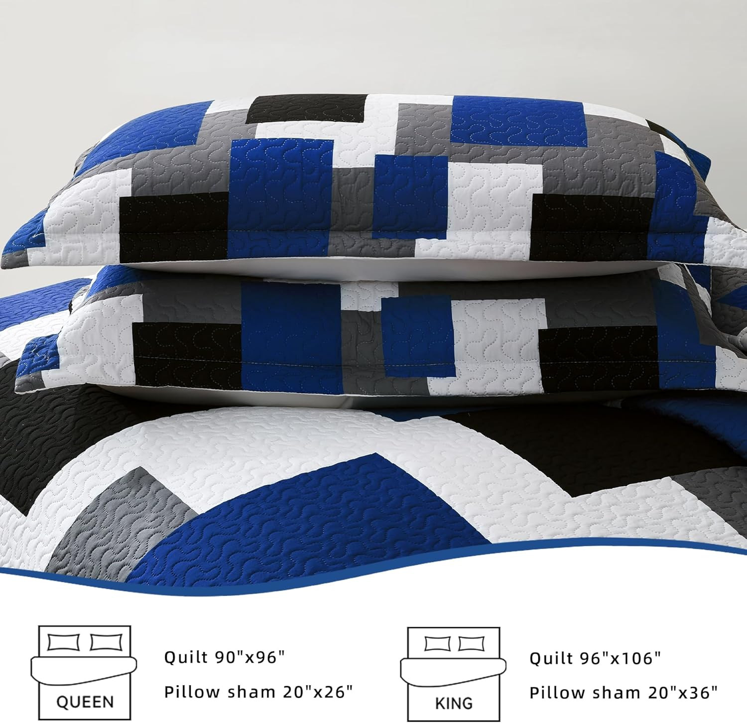 Modern King Size Reversible Blue Grey Quilt Set with 2 Shams - 106x96