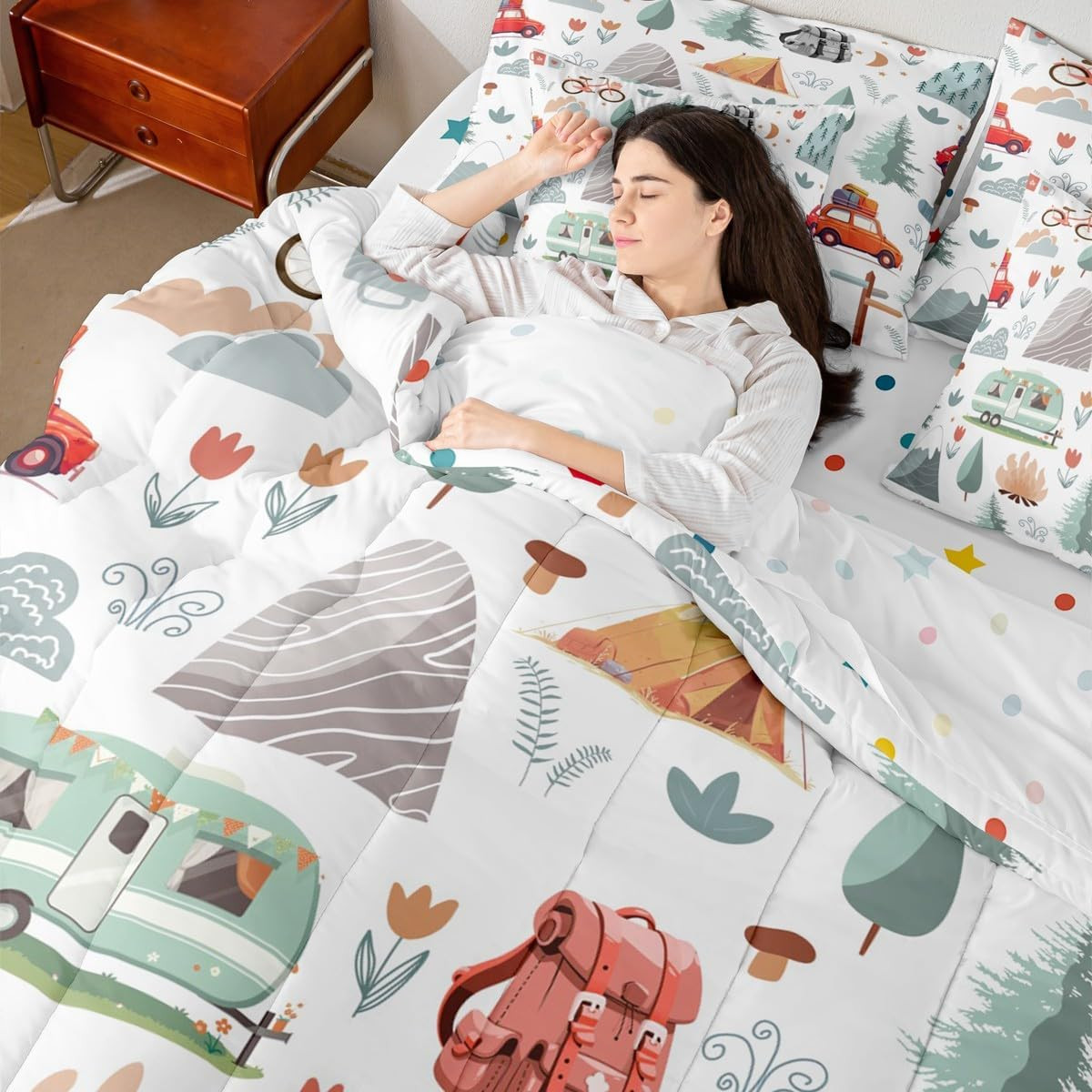 Kids Camper Theme 7 Pcs Comforter Set Queen Bed in a Bag,Happy Camping Bedding S