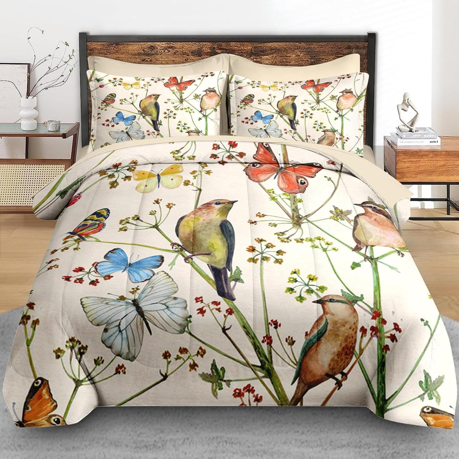 Comforter Set Full Size, Vintage Birds Butterfly Colorful 7 Pcs Bedding for Kids