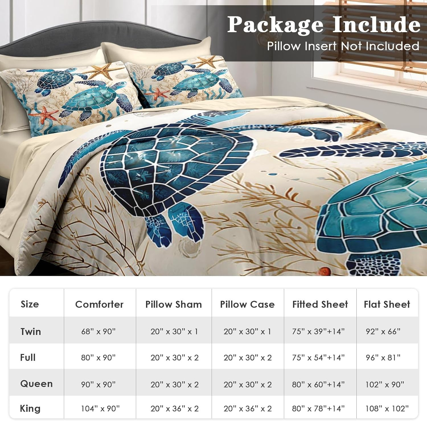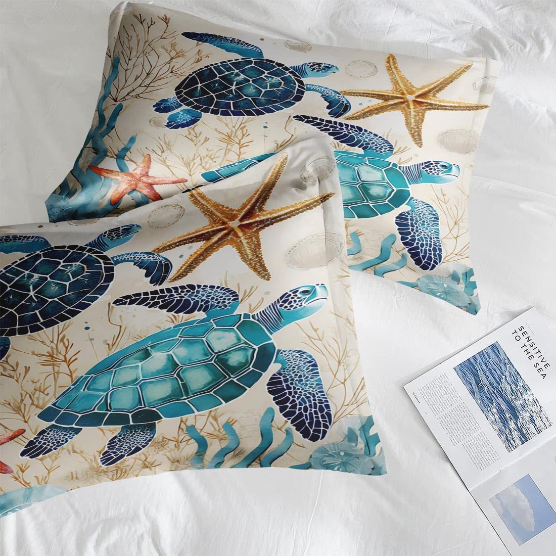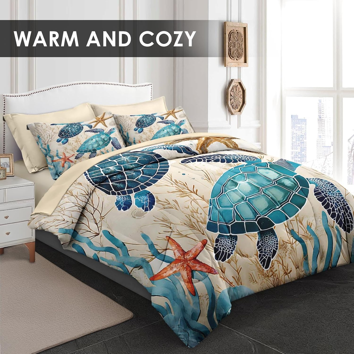 Ocean Coral Sea Turtle 7-Pc Comforter Set for Kids Adults, Full Size