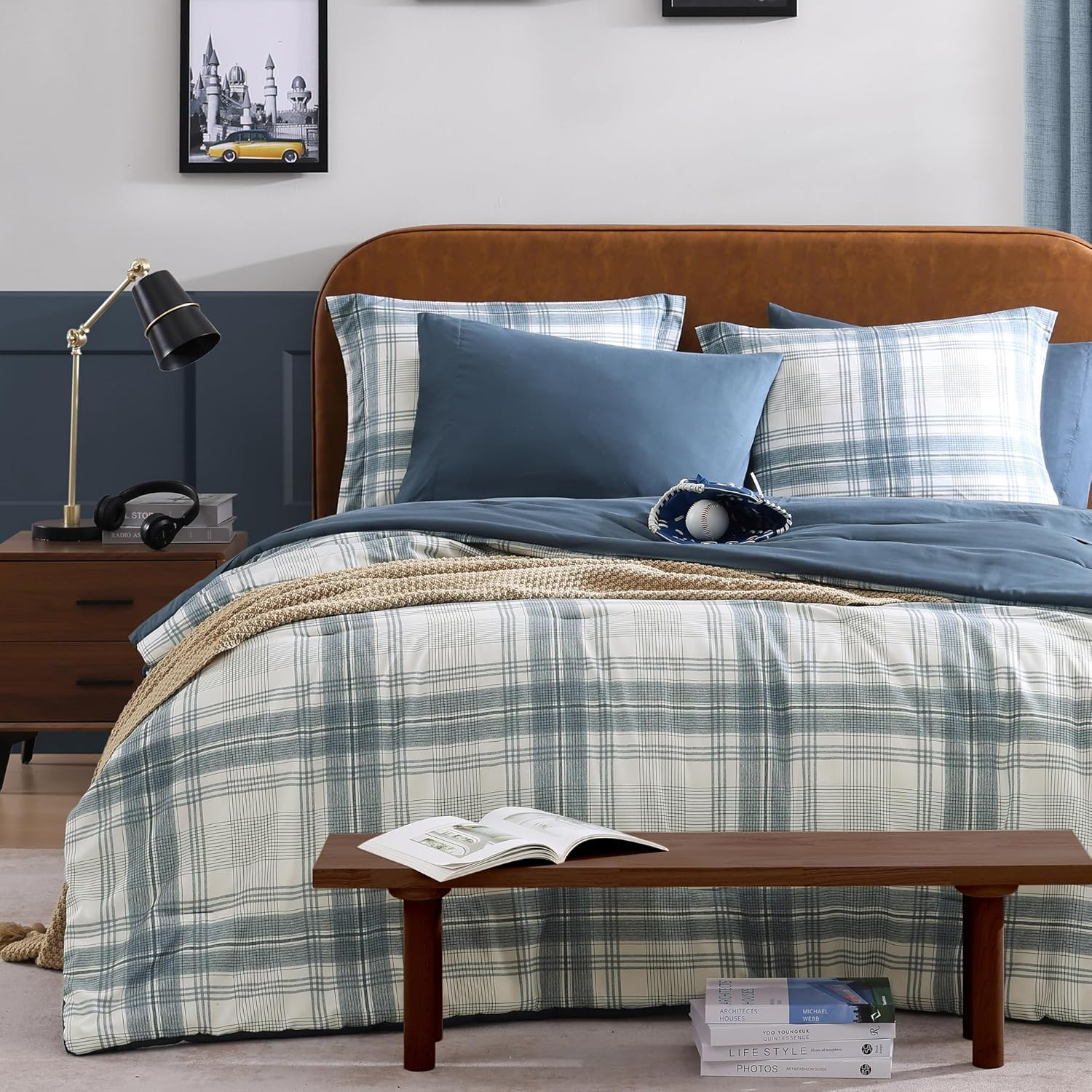 Full Size Comforter Sets, Blue Grey Plaid Bedding Set 7 Piece for Boys Girls Tee