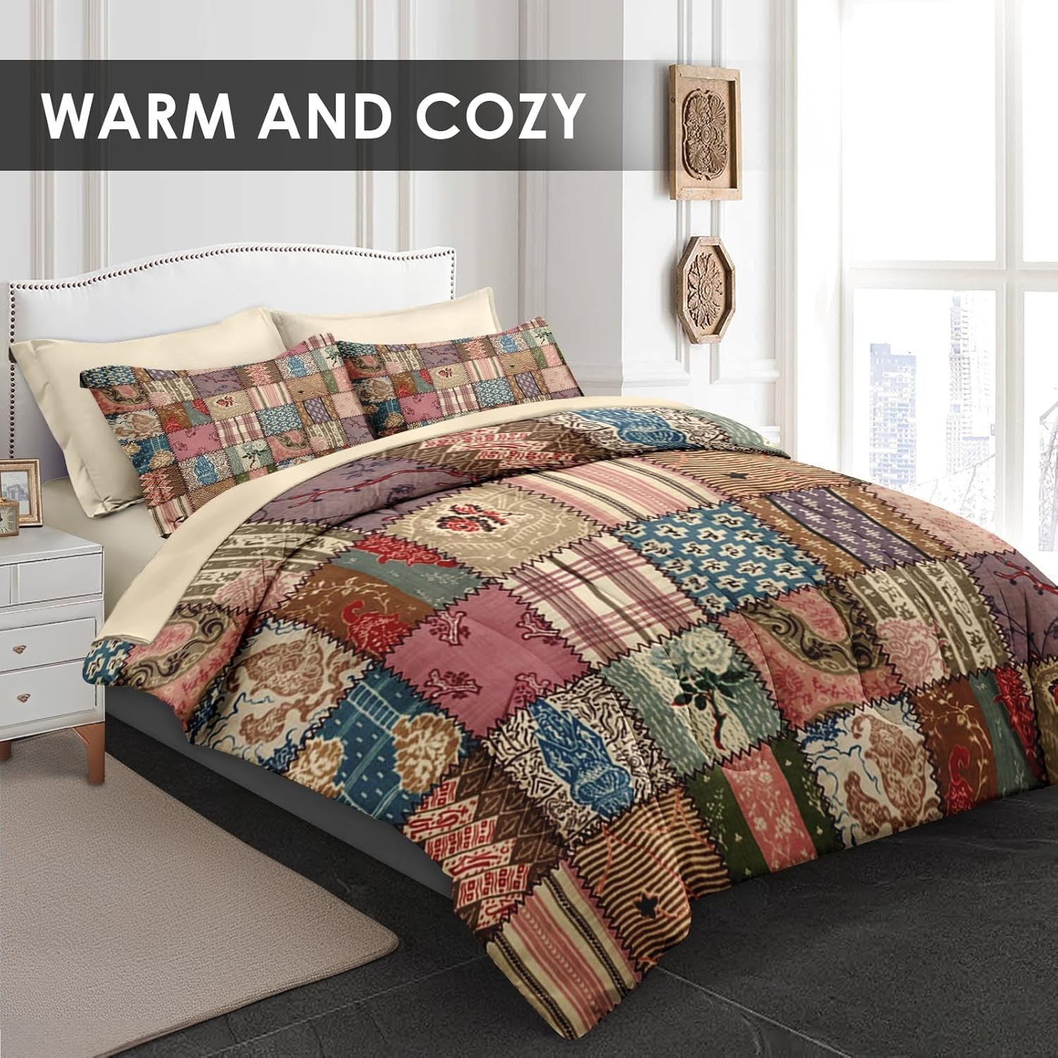 Comforter Set Queen Size, Country Flower Retro 7 Pcs Bedding for Kids and Adults