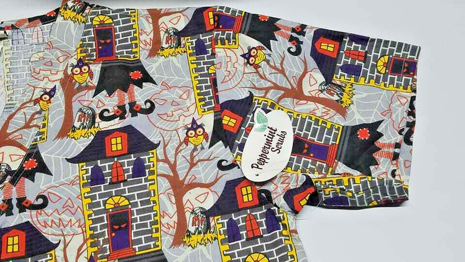 NWT HALLOWEEN Scrub Top Peppermint Scrubs Haunted House Witch Owl Large