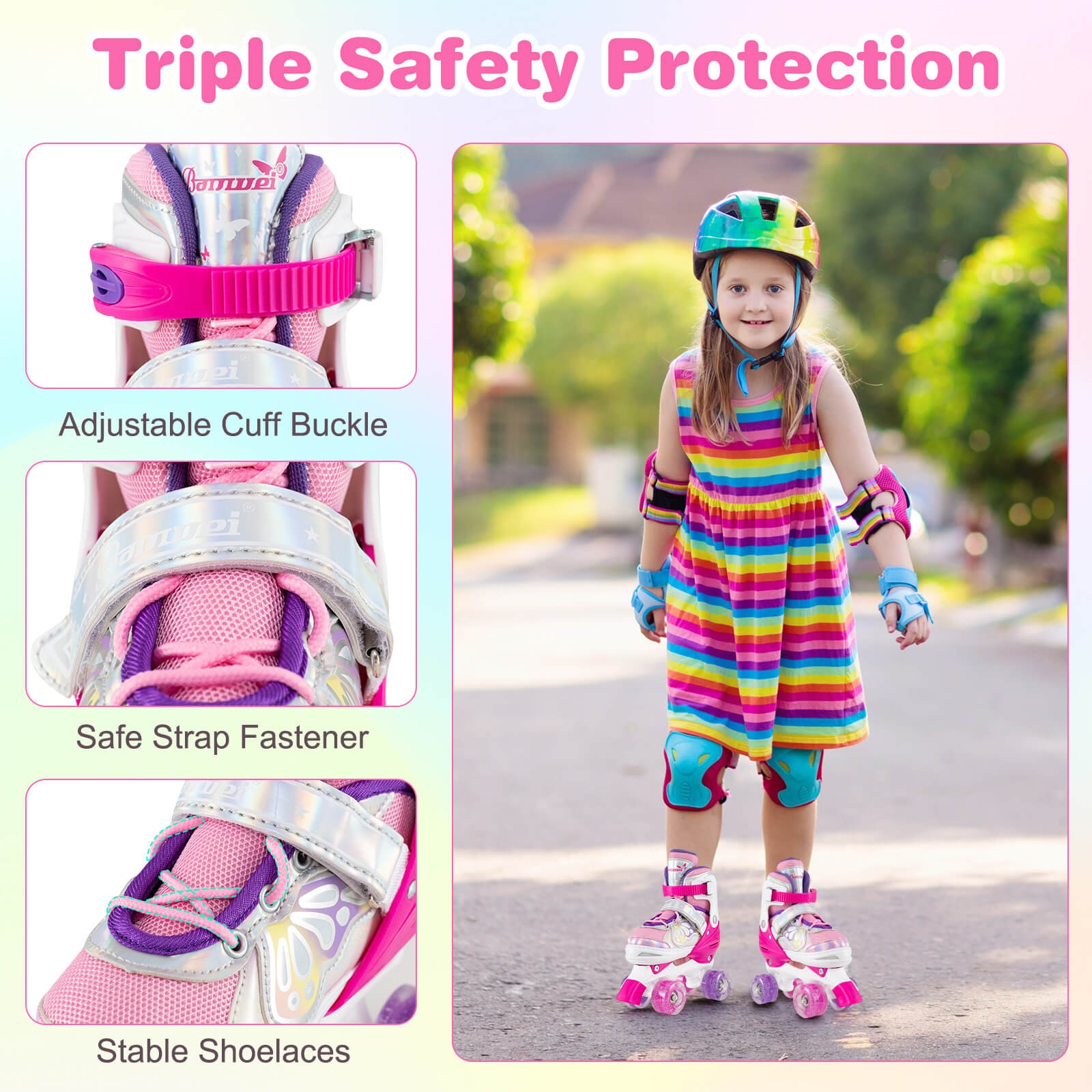 4 Sizes Adjustable Quad Skates w/Light-up Wheels Safety Protection for Ages 8-13