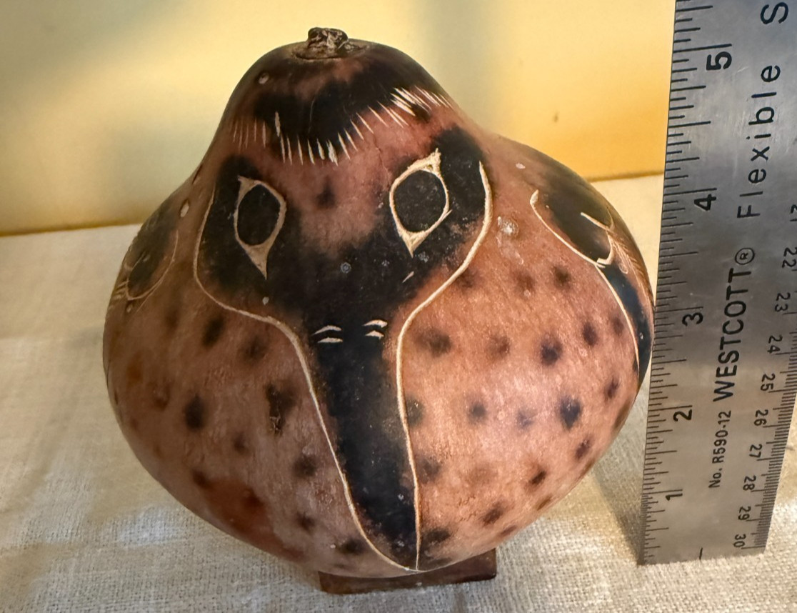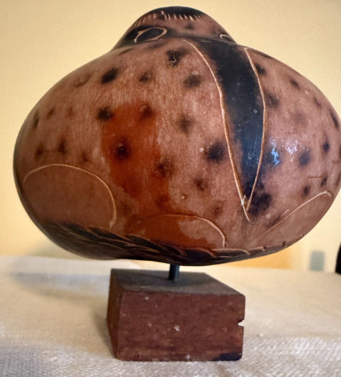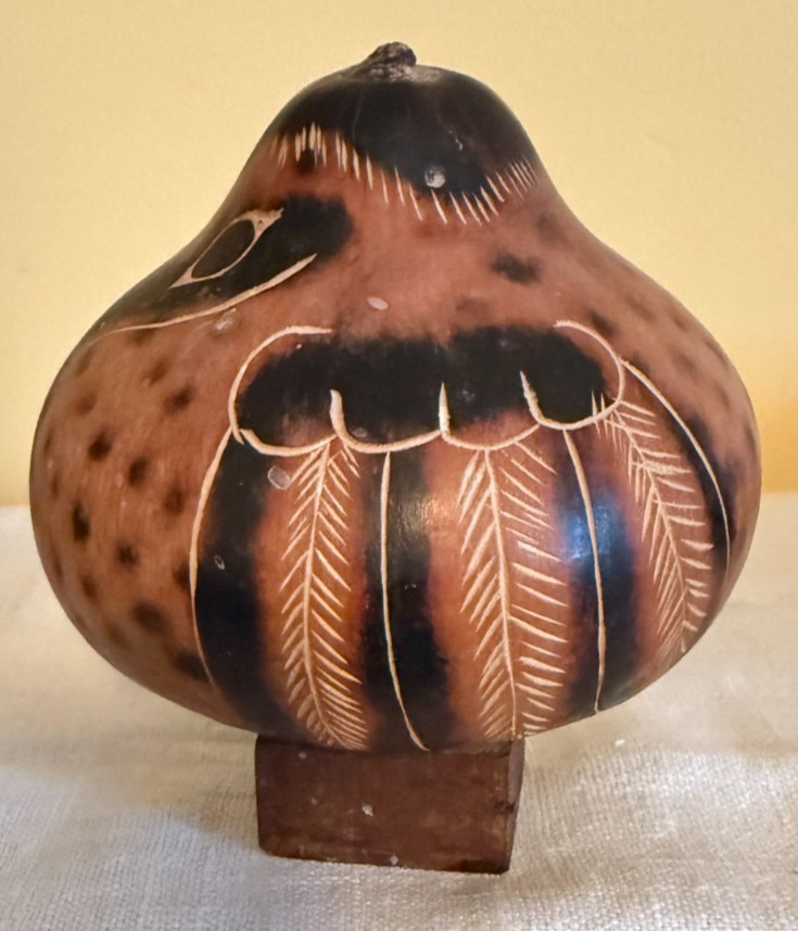 HANDPAINTED FOLK ART BIRD GOURD ON WOOD STAND. PERU VGUC