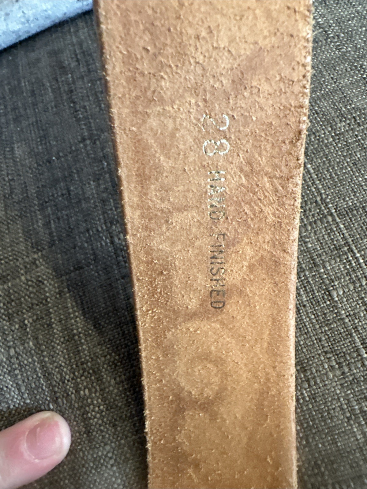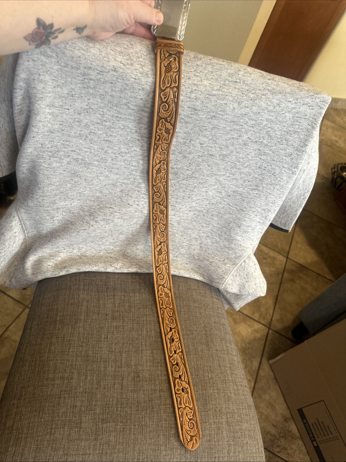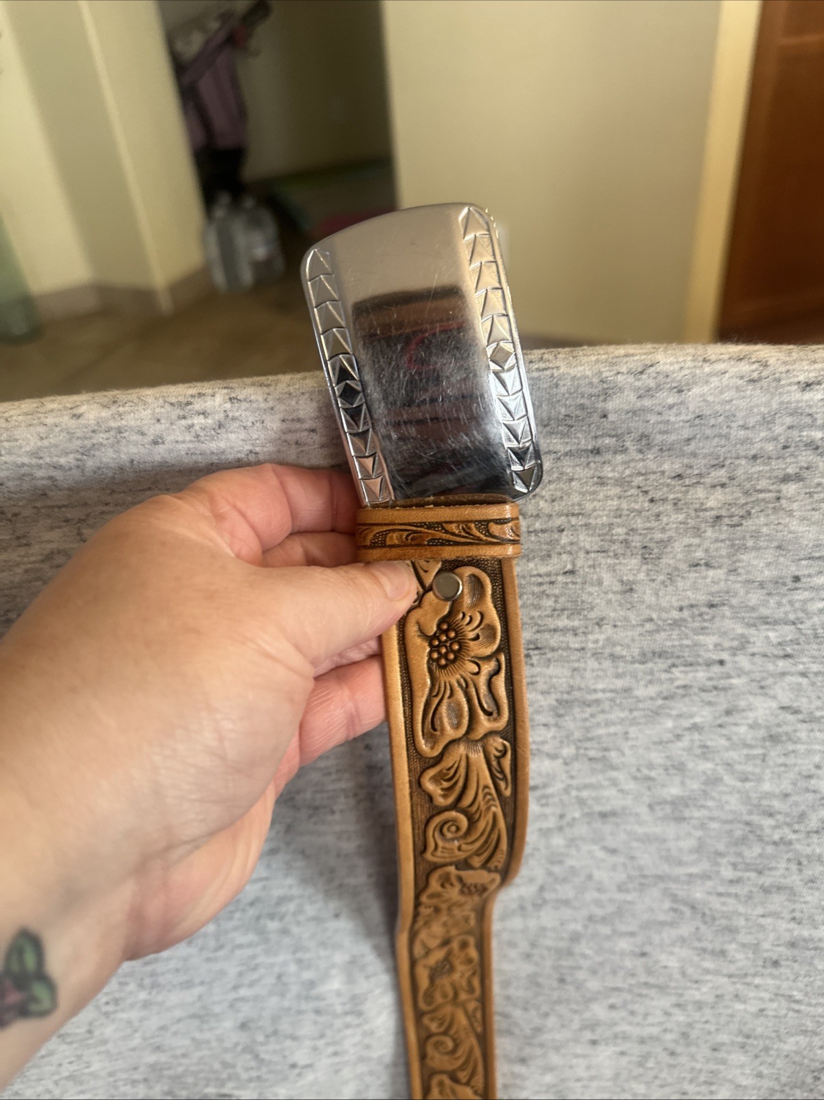 hand-tooled leather belt with a floral pattern and a metal buckle. Size 28