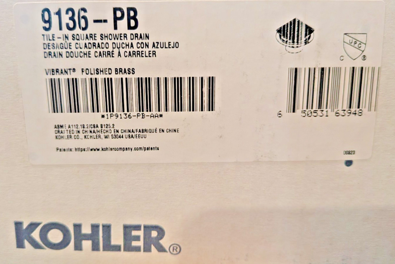 KOHLER Square Design Tile-In Shower Drain, Vibrant Polished Brass K9136-PB