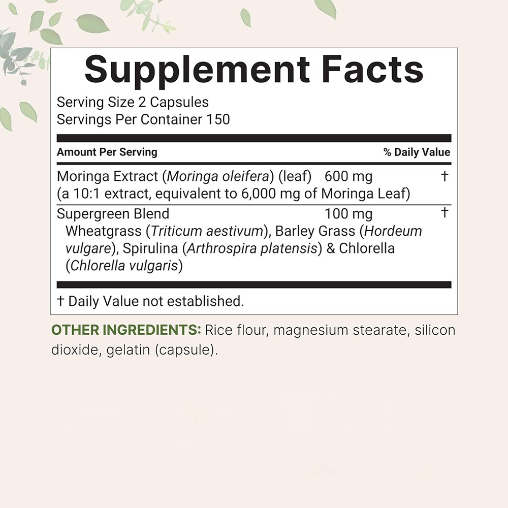 Active Ingredients: Barley Grass, Chlorella, Drumstick Tree (Moringa oleifera), Moringa Leaf, Spirulina, Wheatgrass