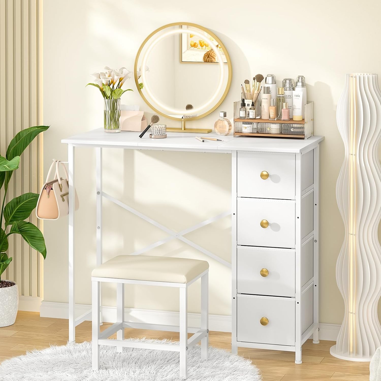 Vanity Desk No Mirror White Makeup Desk with 4 Fabric Drawer Small Table Bedroom