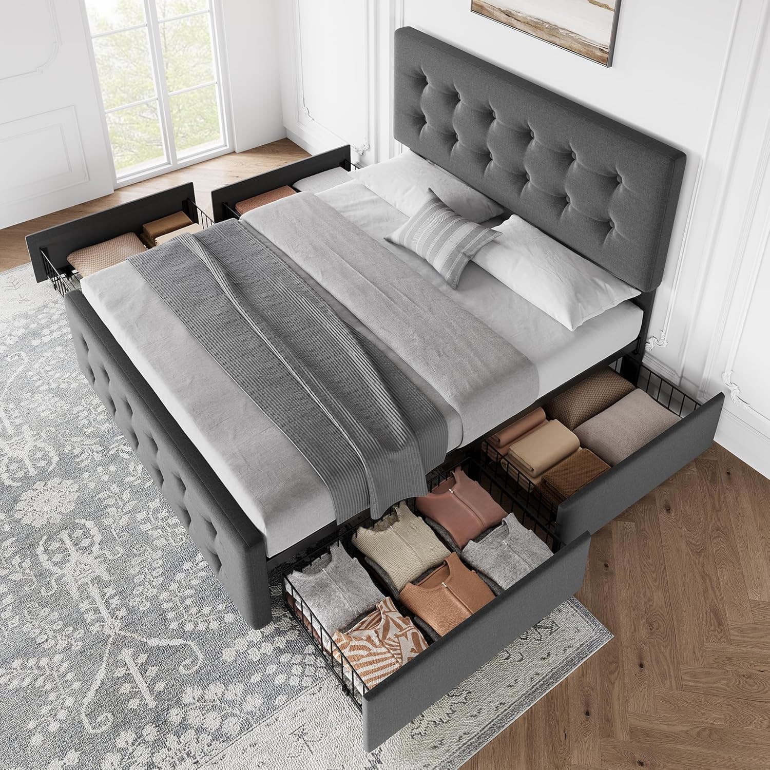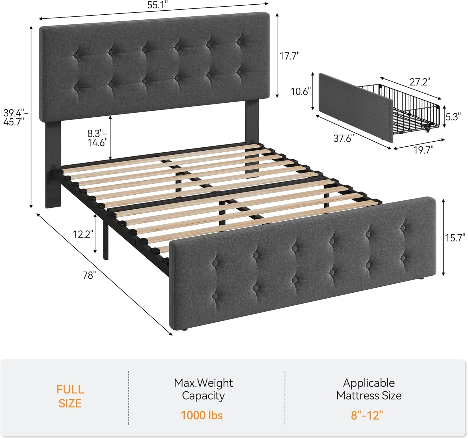 Full Size Bed Frame with 4 Storage Drawers and Adjustable Upholstered Headboard