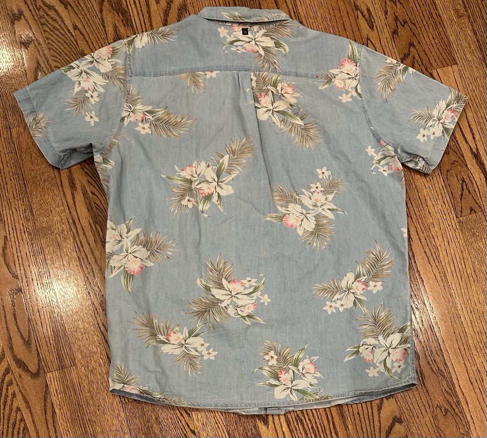 Rip Curl Men s XL Hawaiian Floral Button Up Shirt Blue Chambray Short Sleeve