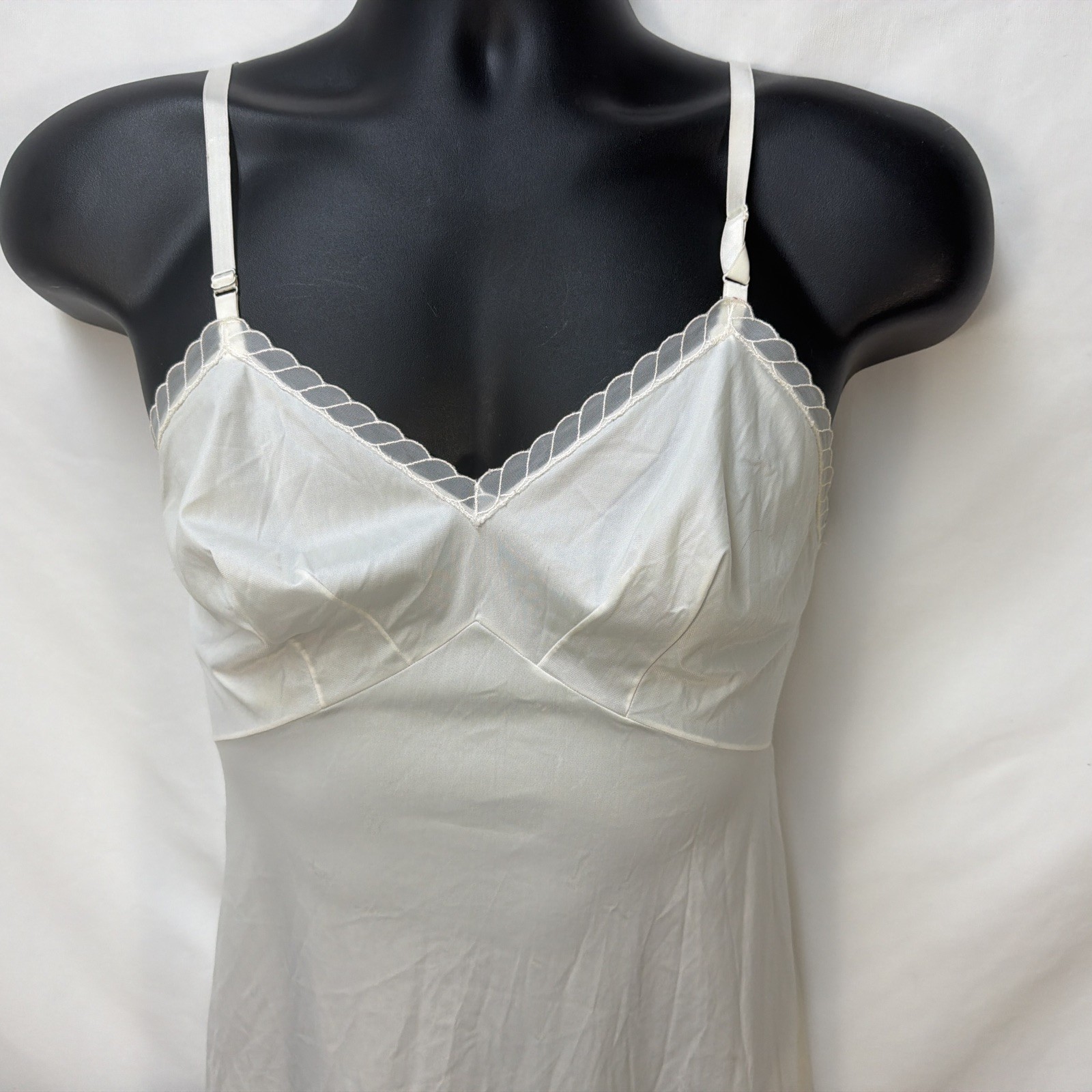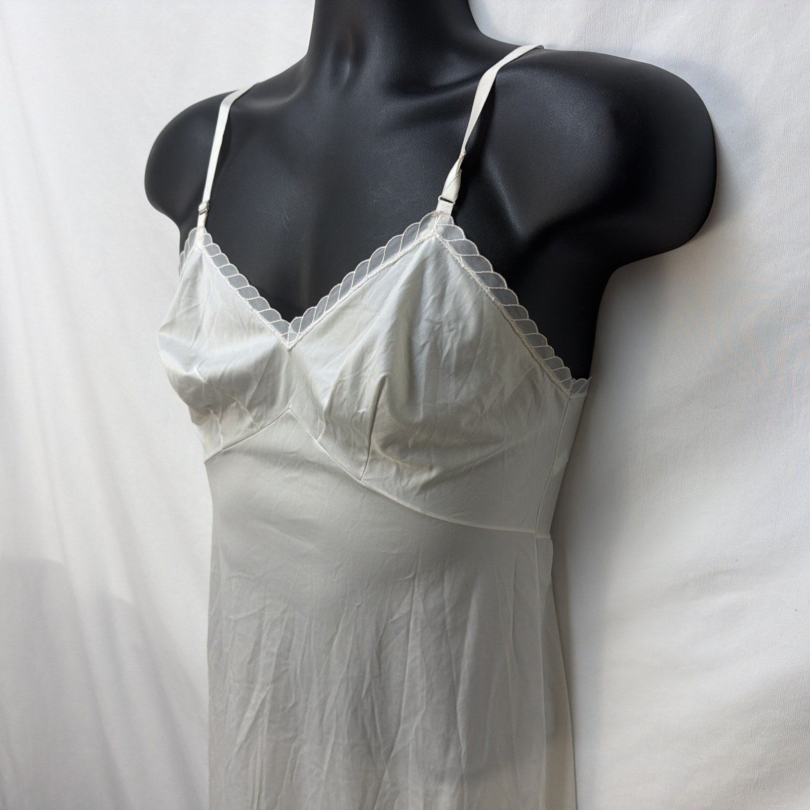 как выглядит VINTAGE 50S VANITY FAIR WHITE SATIN TRICOT NYLON FULL ZLIP LACE LINGERIE 32S USA фото