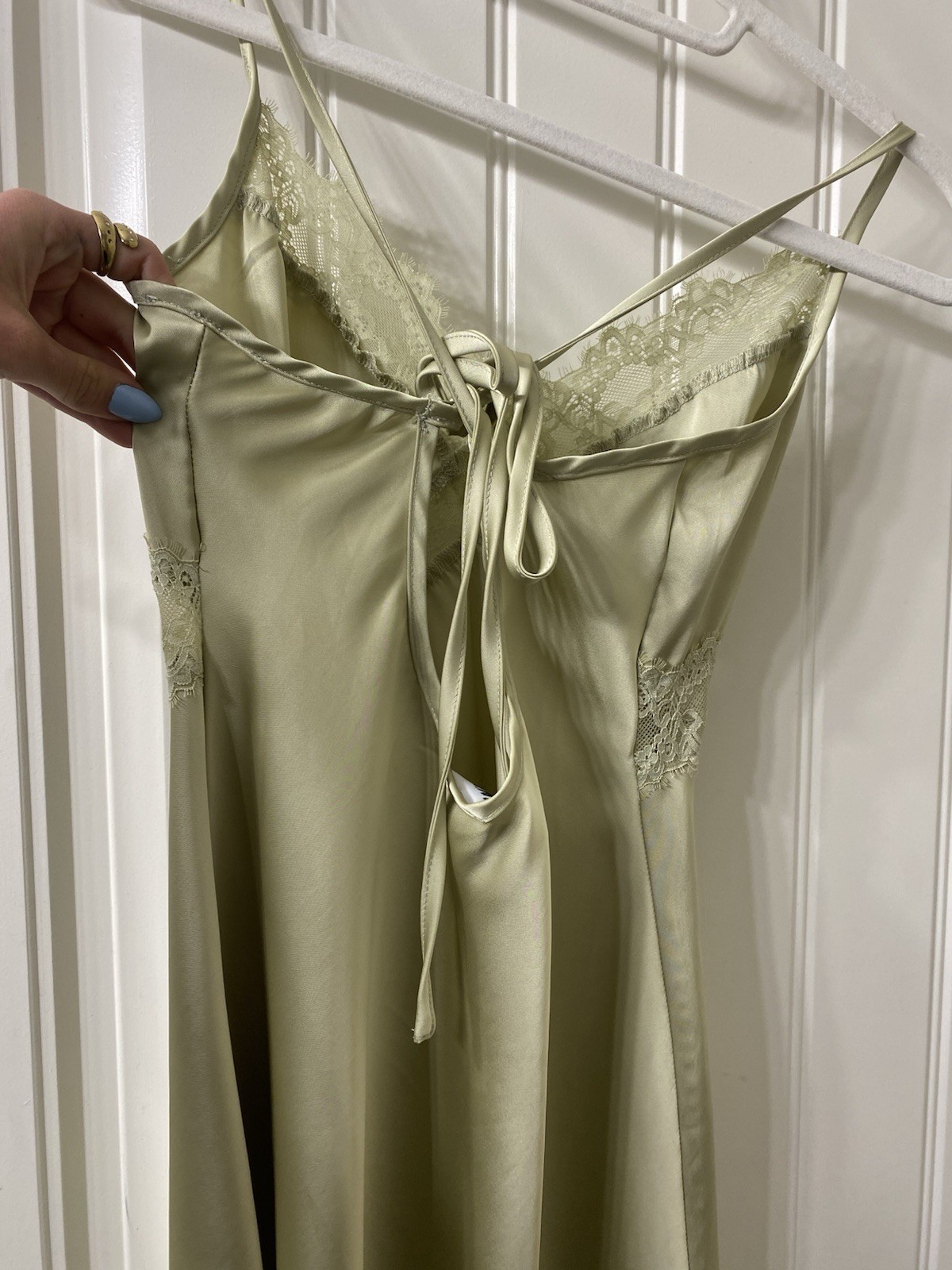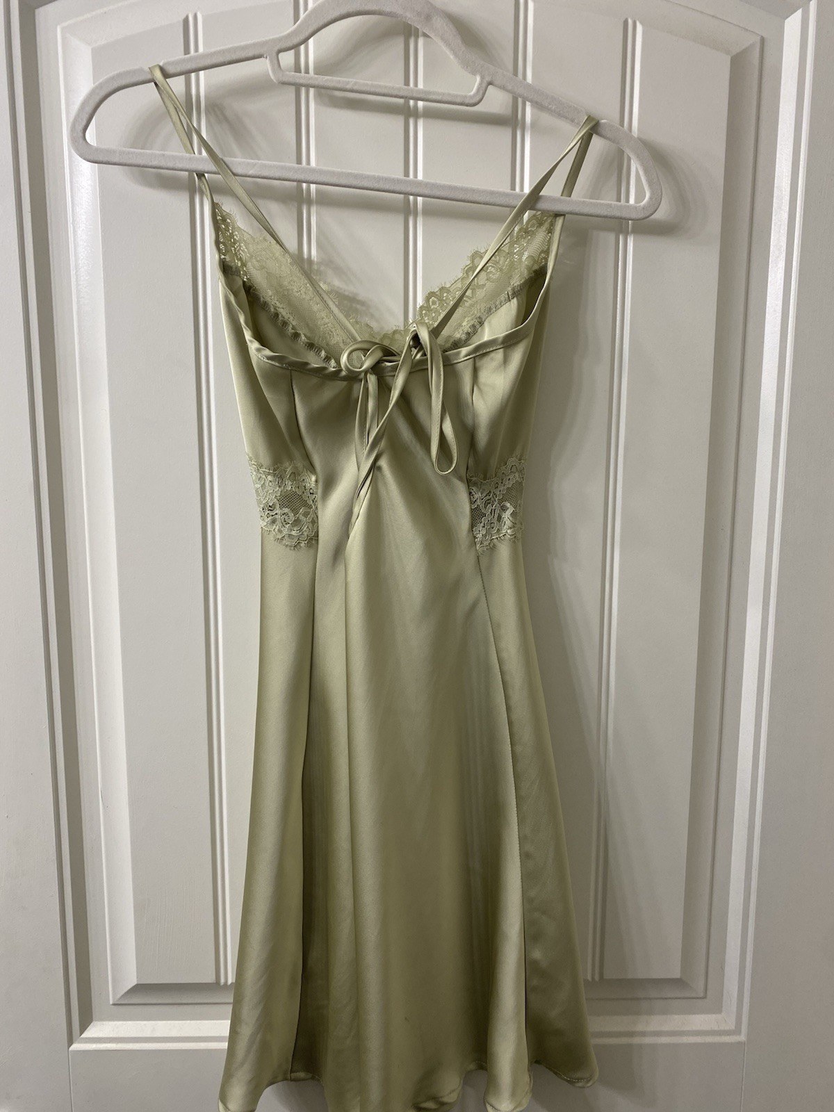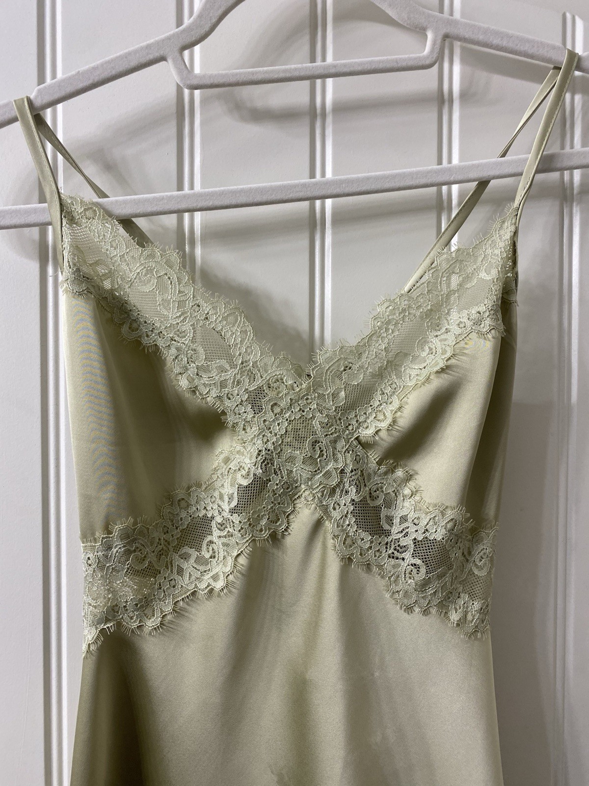 как выглядит Princess Polly Satin Chemise Dress Light Green Lace Accents V-Neck US 4 фото