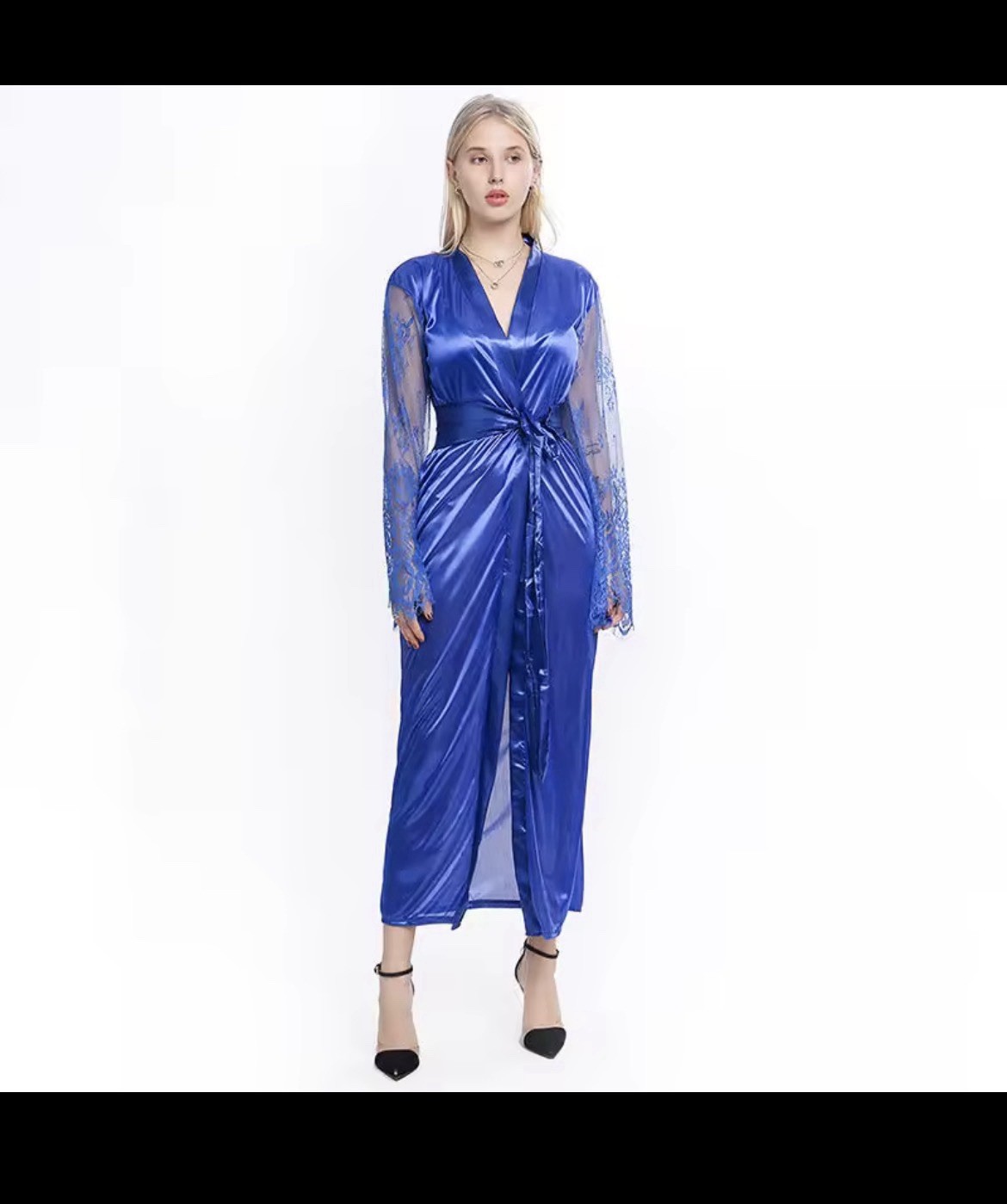 как выглядит Womens Satin Lace Long Sleeve Kimono Robe - Black Pink Blue White фото