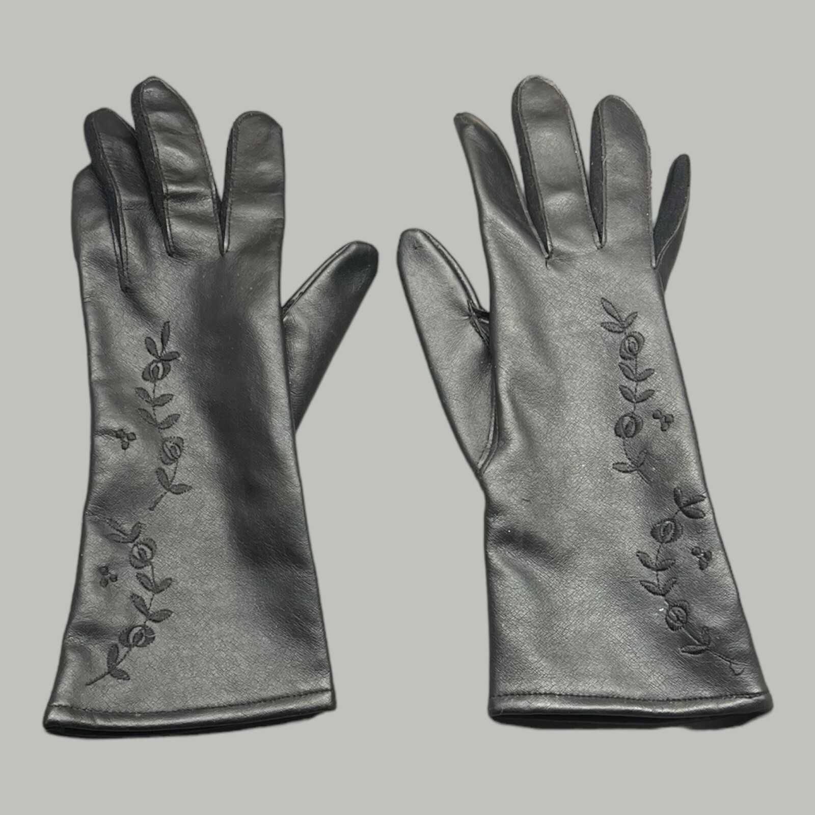 Vintage Black Driving Gloves with Floral Embroidery Faux Leather Approximate 9