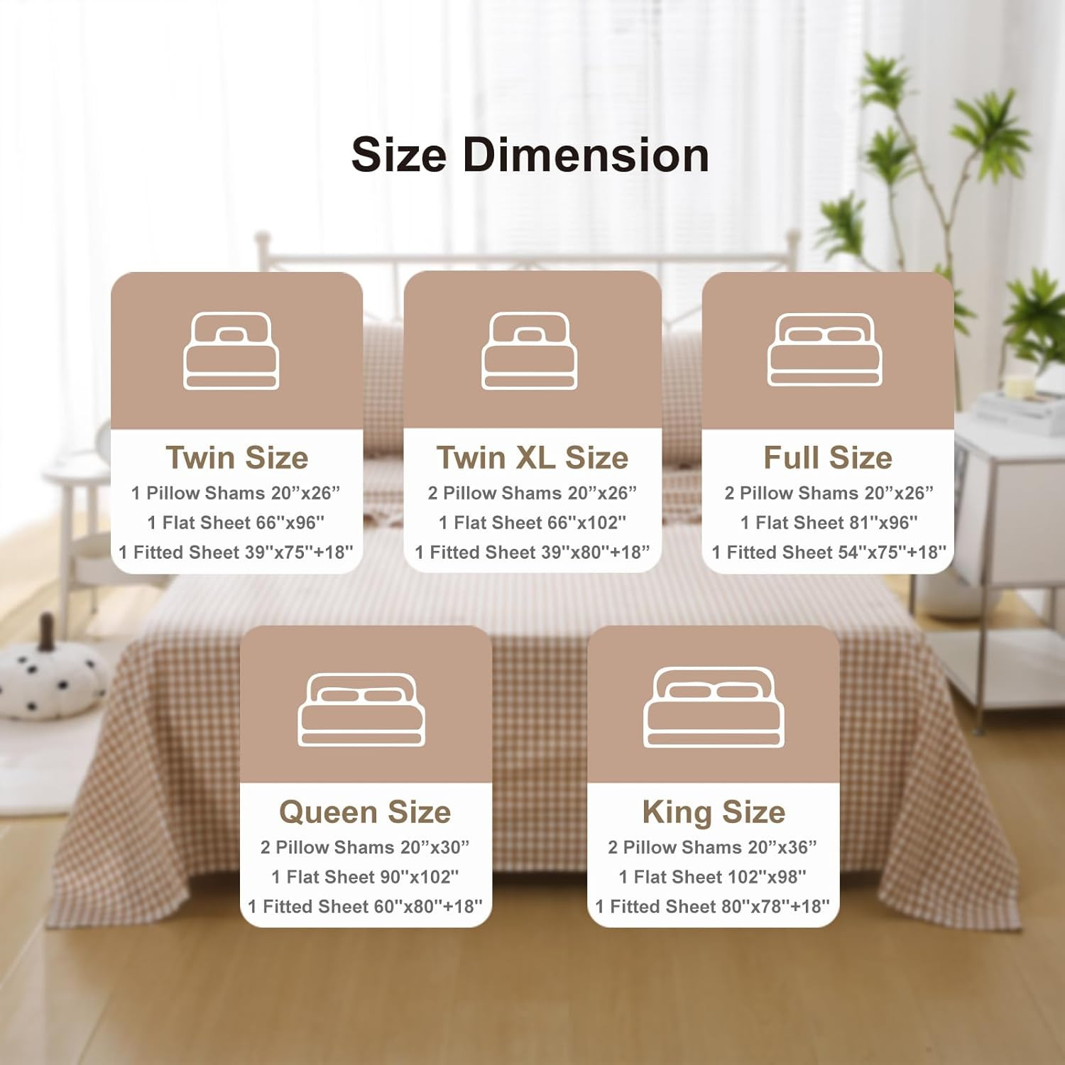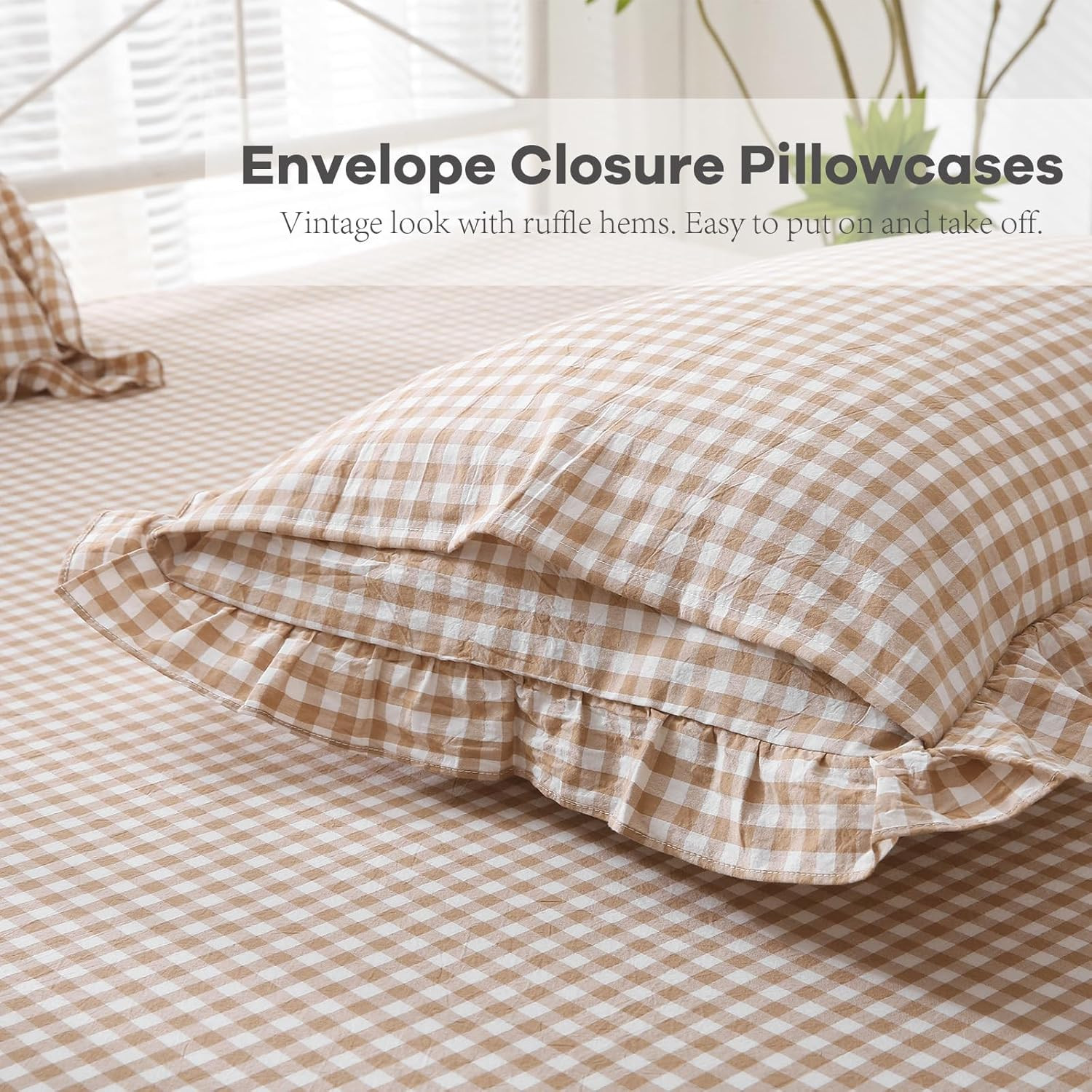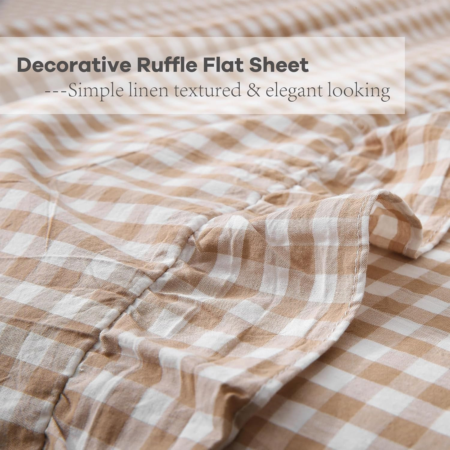 Taupe White Plaid Ruffle Queen Sheet Set, 300TC Washed Cotton, 4-Piece
