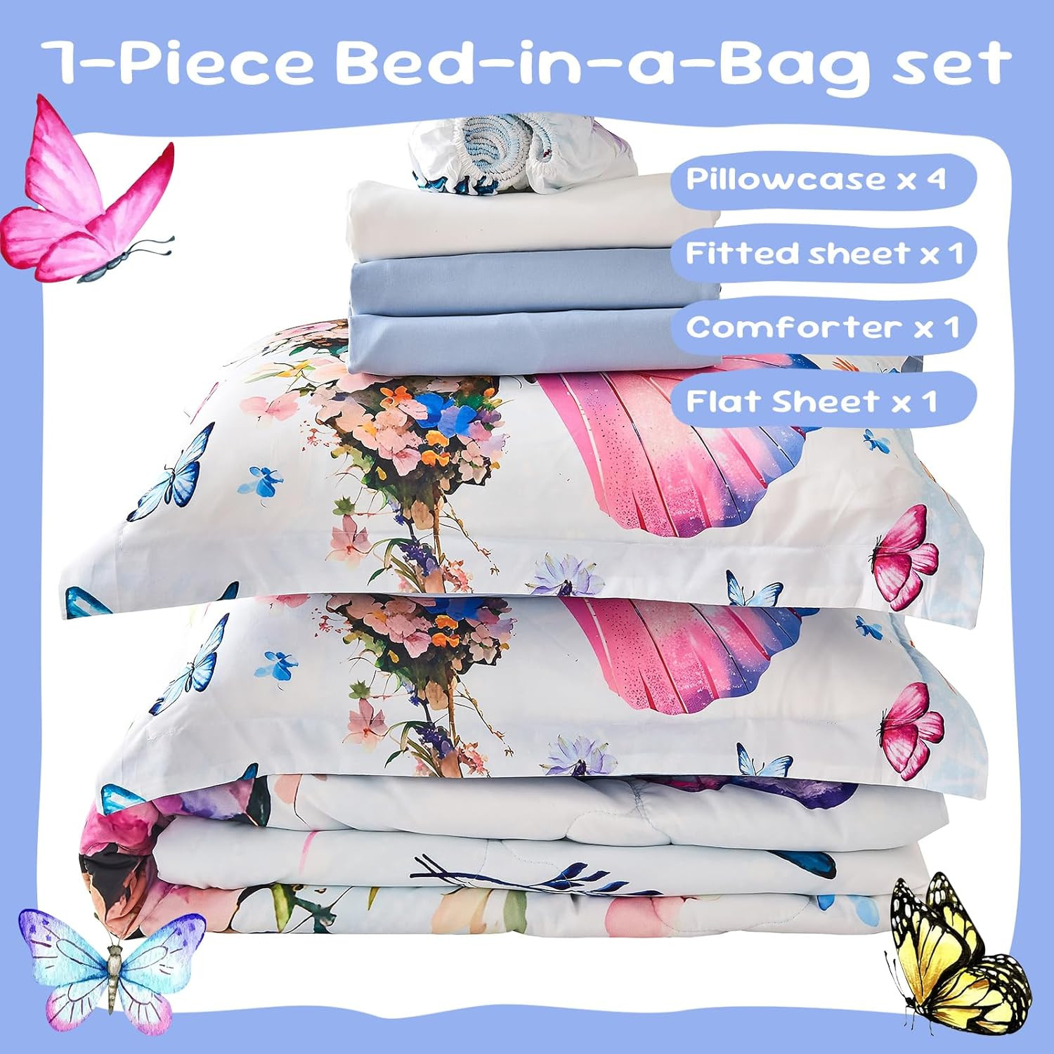 Colorful 3D Butterfly Comforter Set Queen Size for Girls Women - 7 Pieces