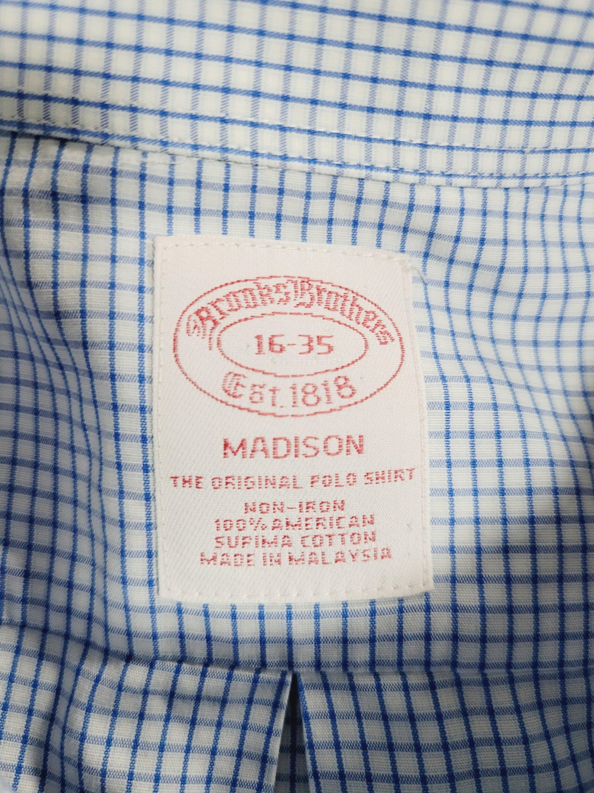 Brooks Brothers Dress Shirt Mens 16-35 Blue Check Madison Non Iron Supima Cotton