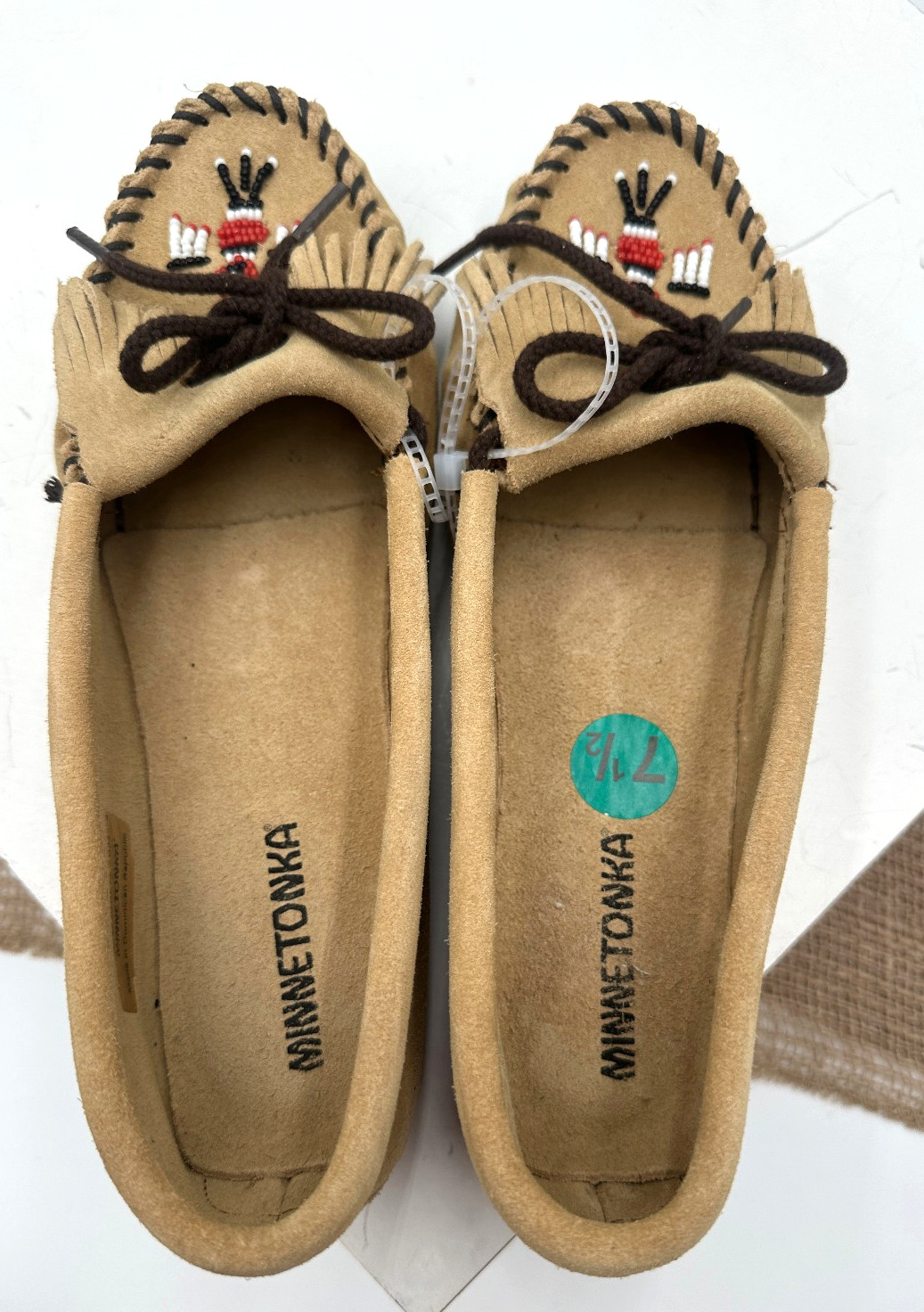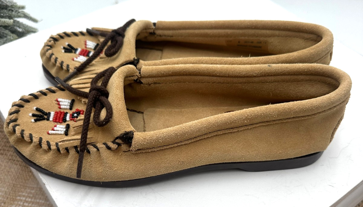 как выглядит MINNETONKA Tan Beaded Thunderbird Fringe Leather Moccasins-Sizes 7.5 8 фото