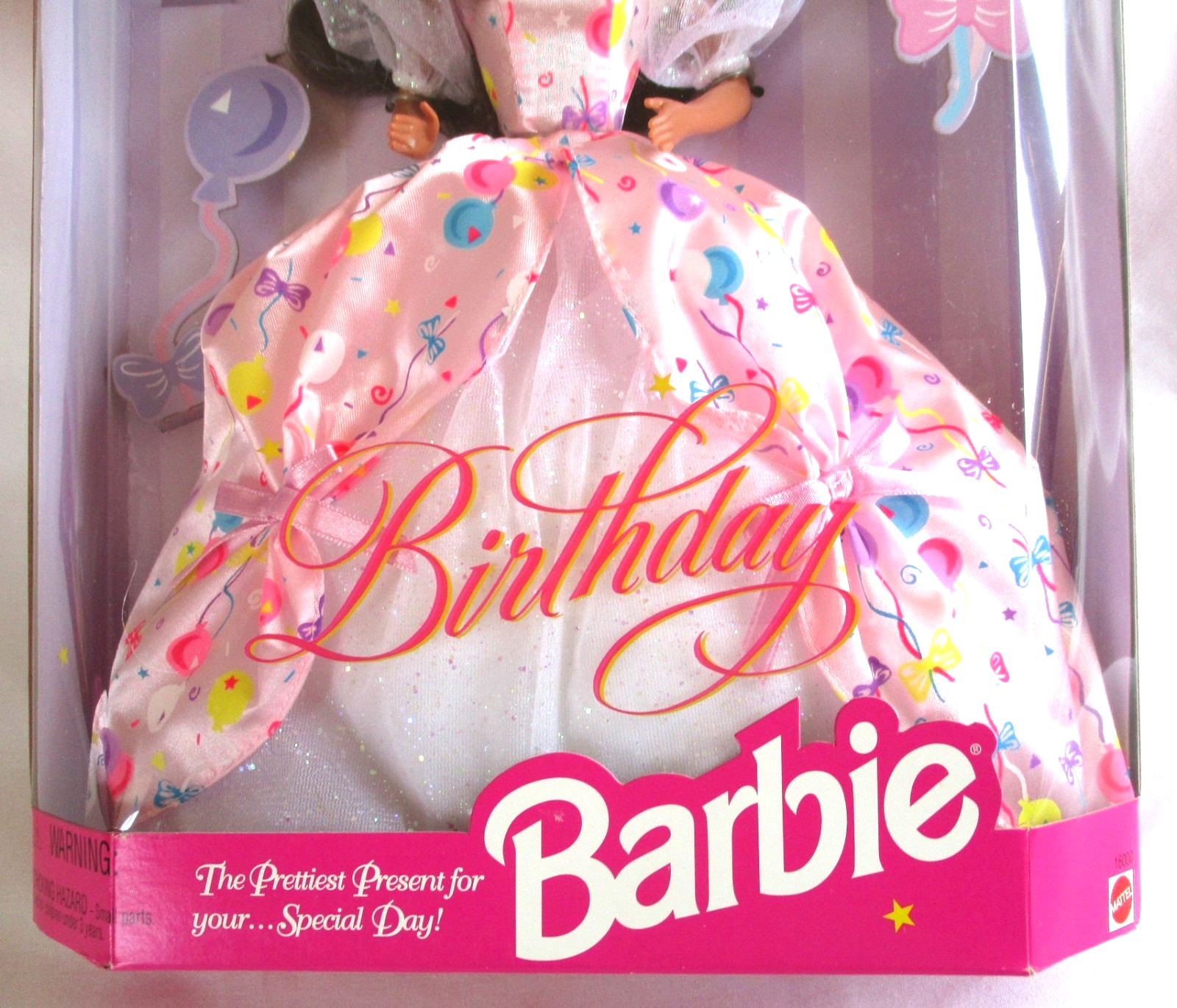 VTG 1996 Birthday Barbie Doll Brunette Pink Balloon Print Gown Mattel 16000 NRFB