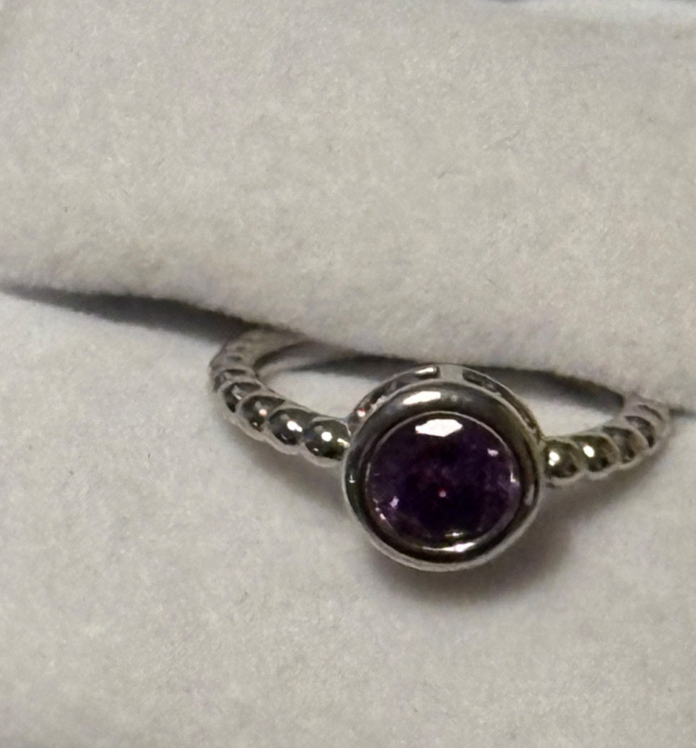 Size 6.5. Genuine Purple Amethyst Gemstone Ring. Set In Silver Band.