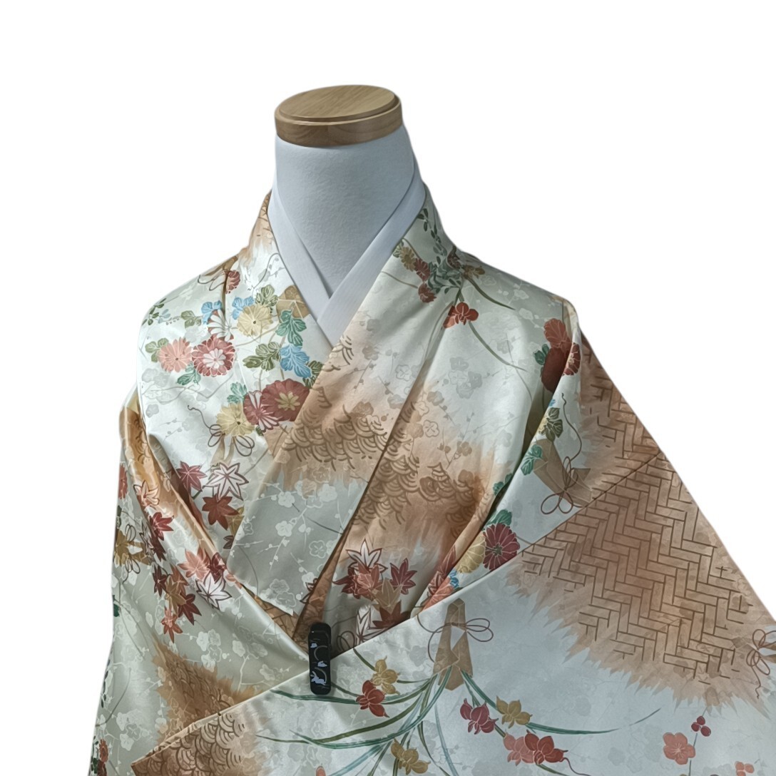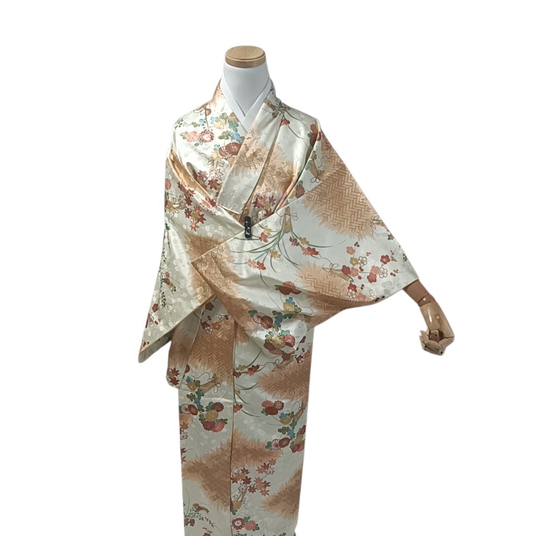 как выглядит Kaerutei Kimono Fine Pattern Orange Flower Synthetic Fiber Used Japan фото
