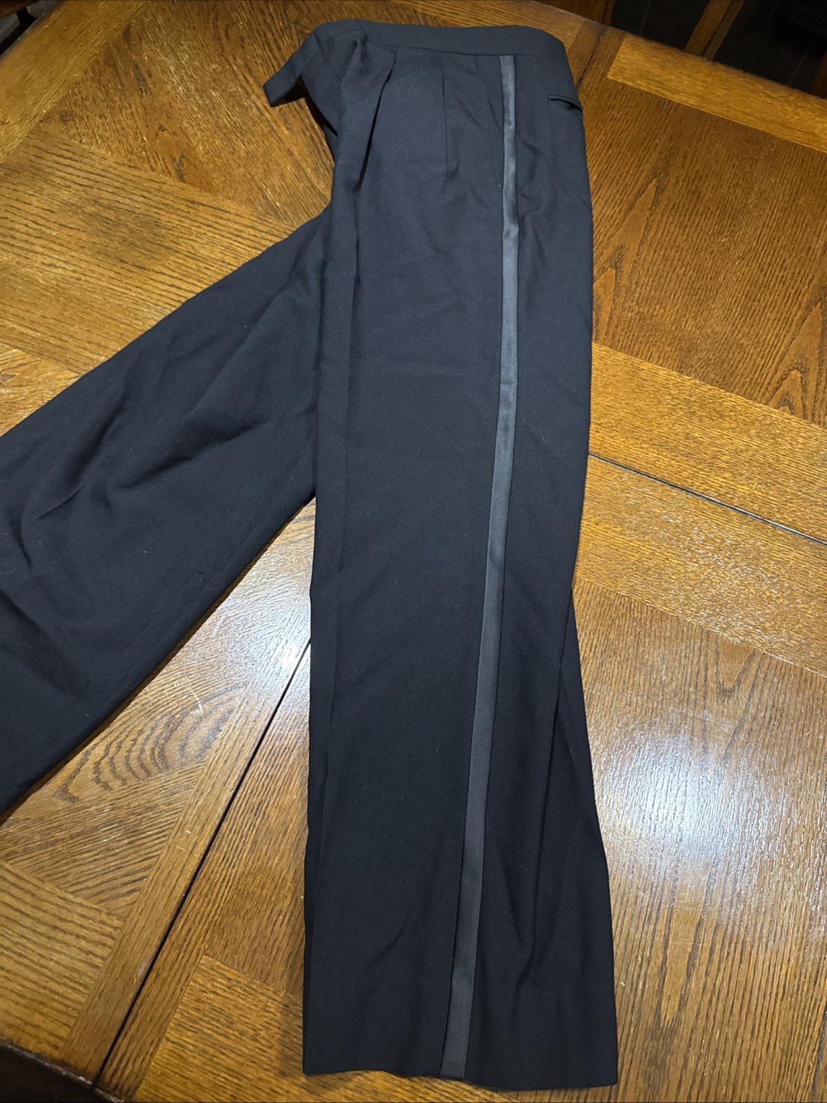 как выглядит Black Pleated Satin Stripe Tuxedo Pant - 100 Wool фото