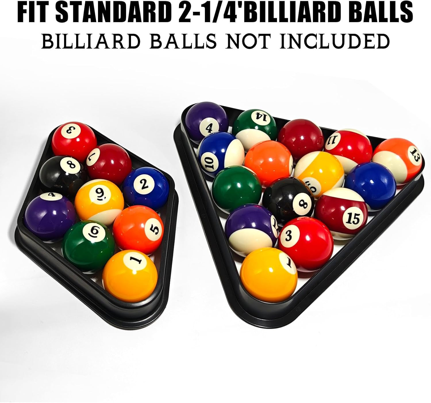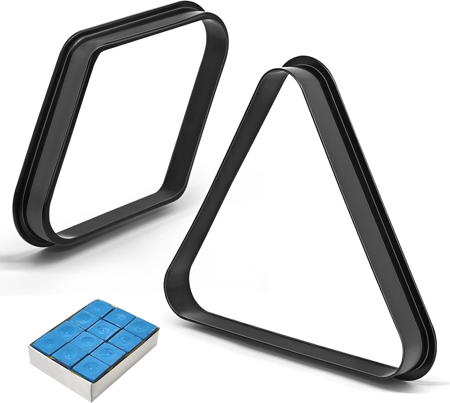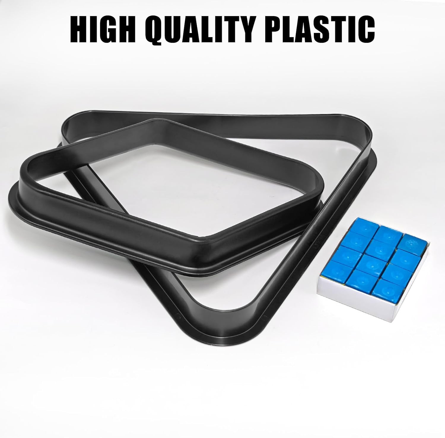 Included Components: 1 Sturdy plastic pool ball triangle rack and 1 diamond rack,Chalk