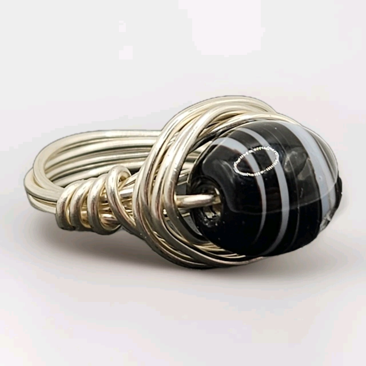 Silver-ToneWire Wrapped Lampwork Black White Glass Bead Ring Handcrafted Size 6