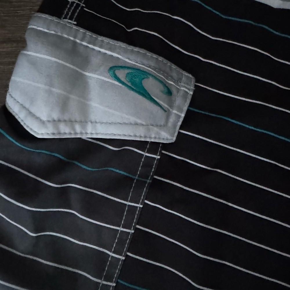 как выглядит Striped Swim Shorts - Black, Gray, and Blue. фото
