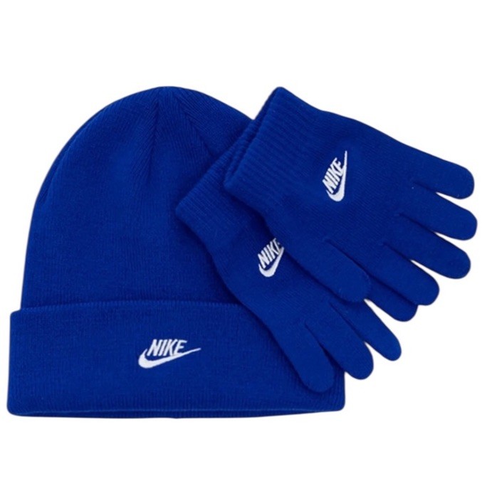 как выглядит Nike Beanie Gloves Set Kids Boys Unisex Girls Logo Blue White Knit фото
