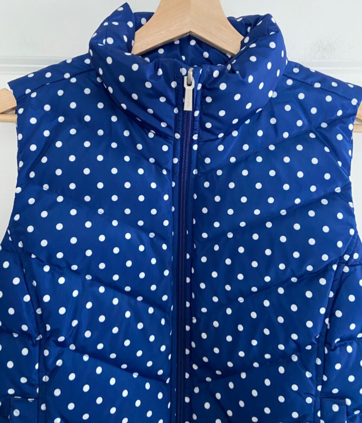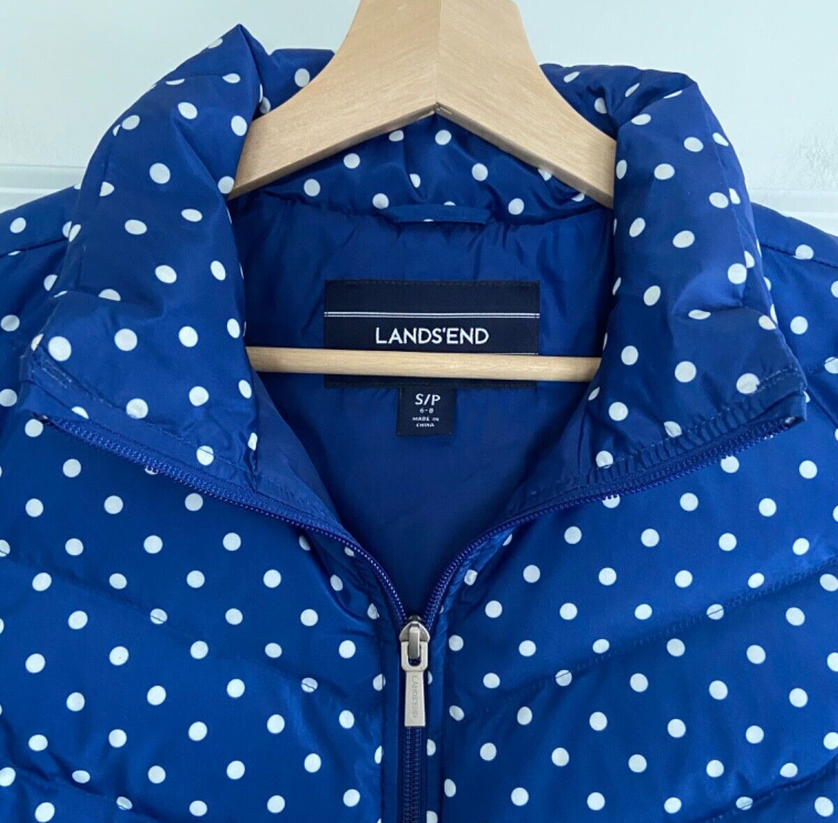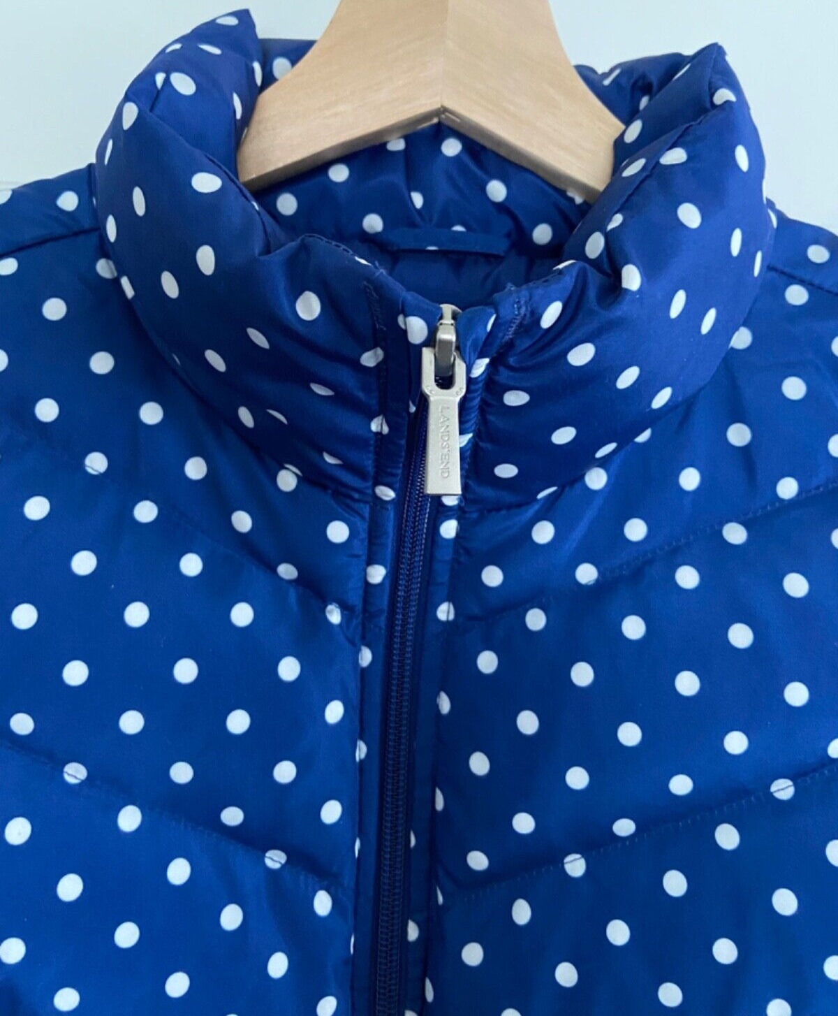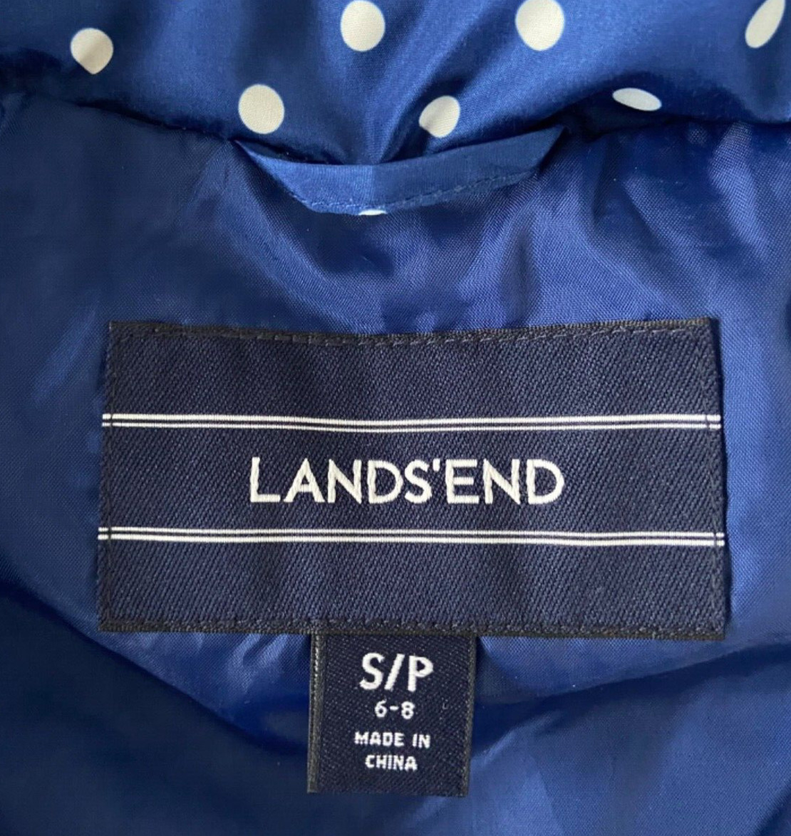 как выглядит Lands End Down Fill Puffer Vest SP 6 8 Zip Up Blue Polka Dot Quilted Gorpcore фото