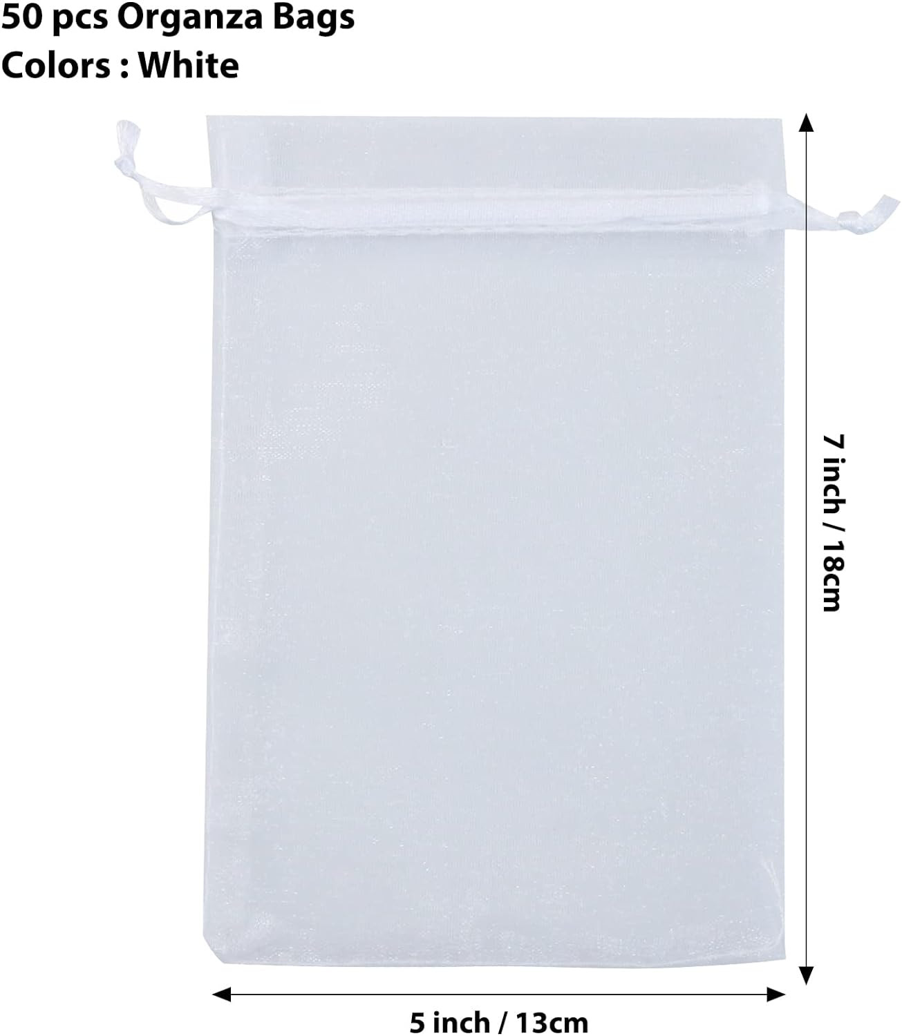 Included Components: 50 Pack White Organza Bags 5x7 inch