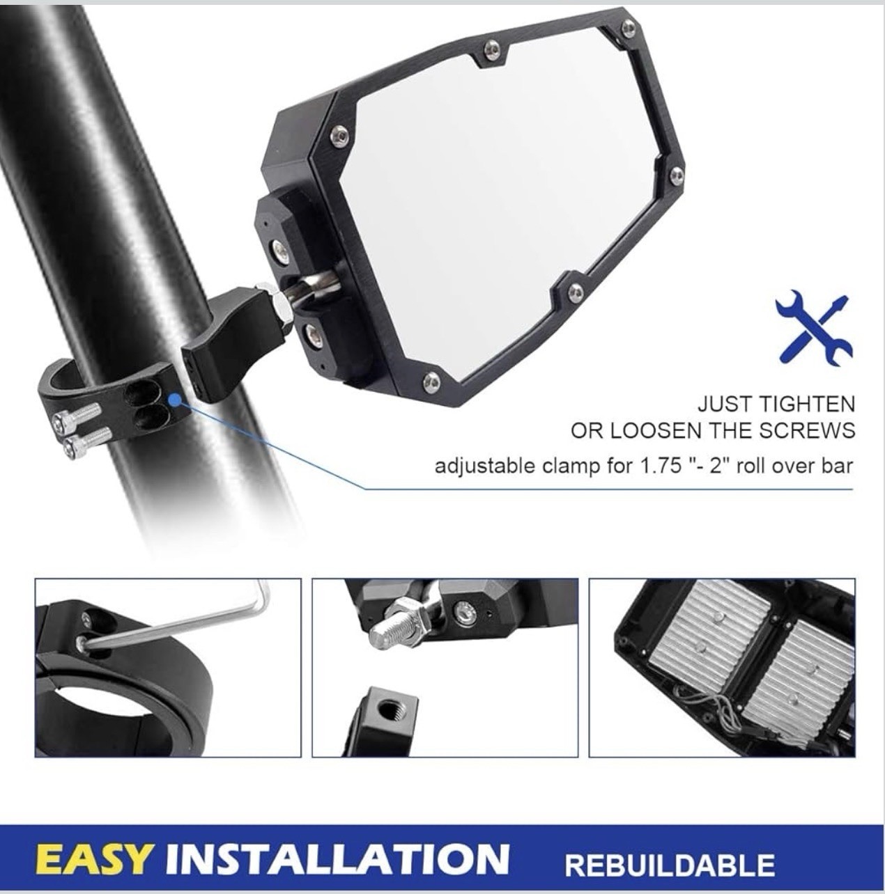 UTV Side Rear View Mirrors with LED Spot Lights w/Wiring Fit 1.75 - 2 Roll