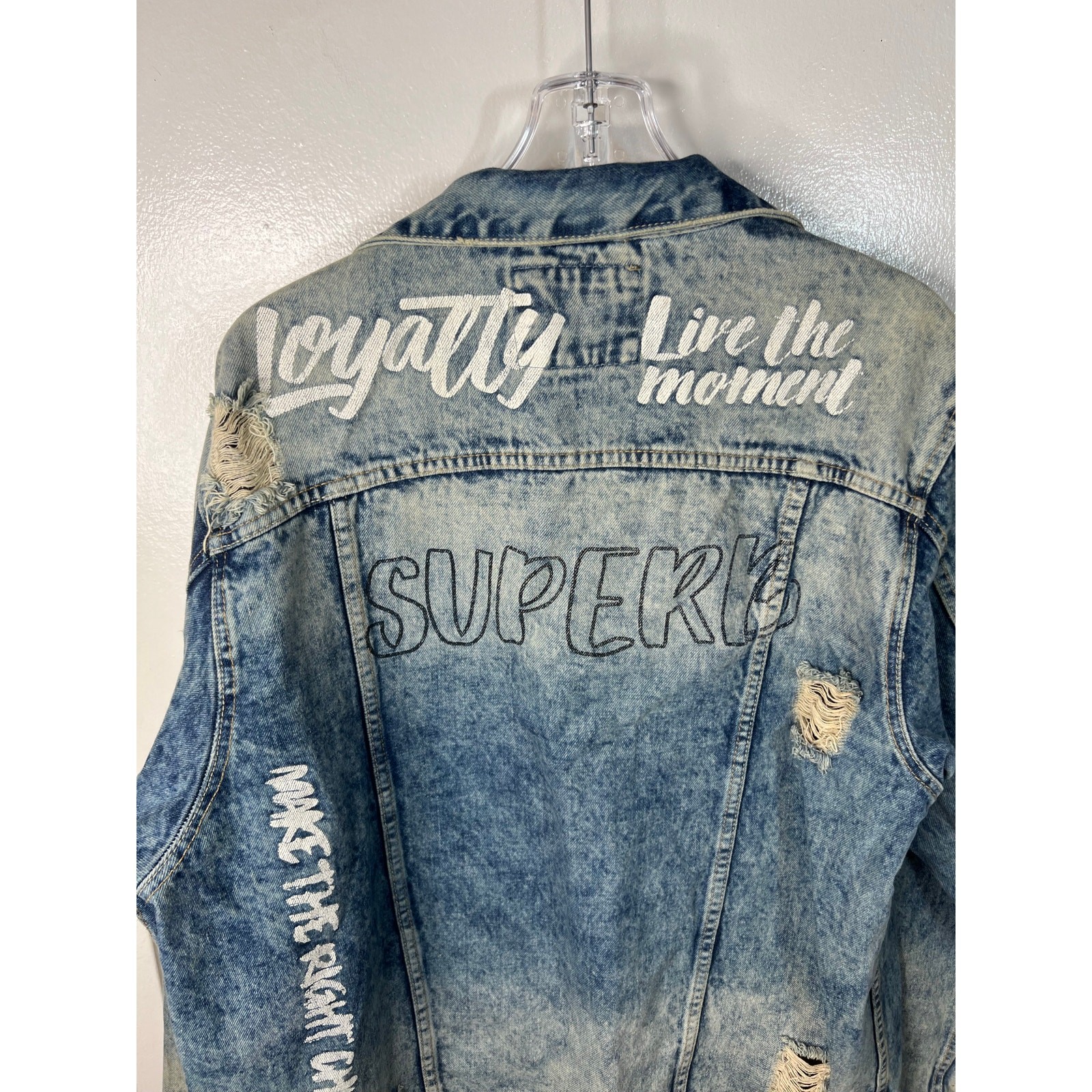 как выглядит Victorious Mens Graffiti Distressed Denim Jacket Blue Size L фото