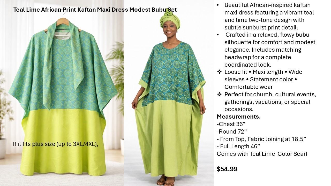 African Kaftan Maxi Dress Women Teal Lime Print Multitone Modest Bubu With Scarf