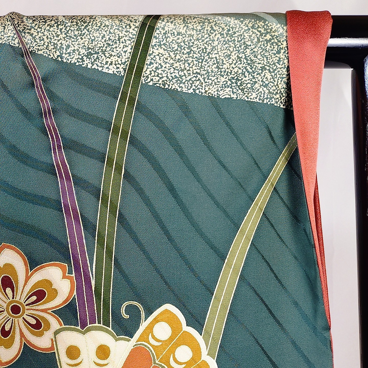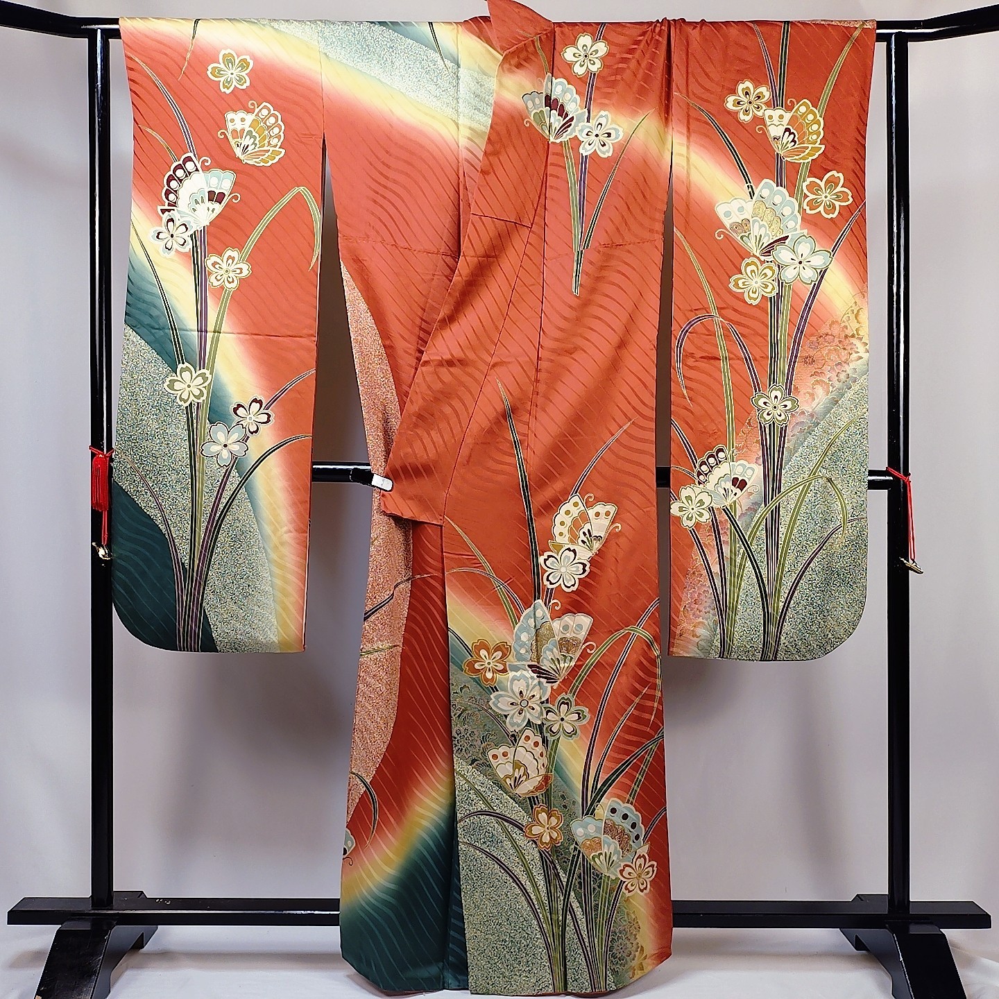• Vintage Japanese Silk Furisode Kimono Rust Orange, Butterfly Sakura