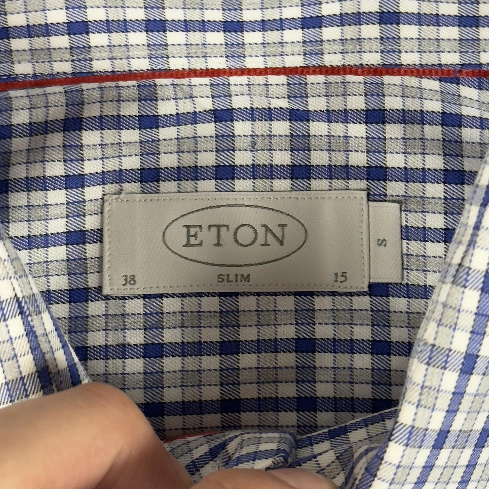 Eton Shirt Mens Small Blue White Check Slim Fit Button Dress Long Sleeve 15 38