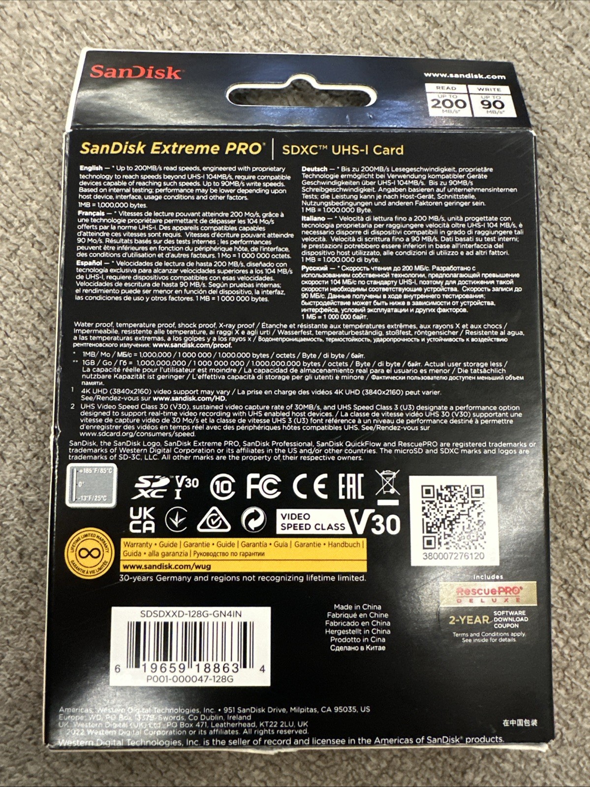 SanDisk Extreme PRO 128GB UHS-I U3 SDXC 200MB/s 4K Memory Card SDSDXXD-128G