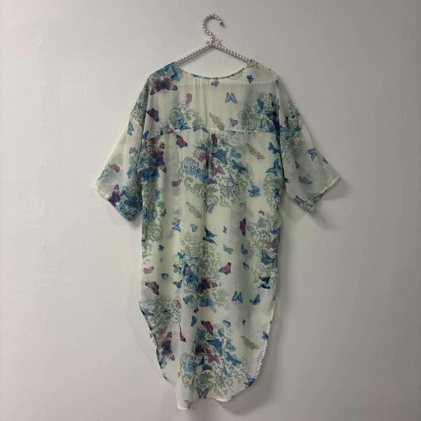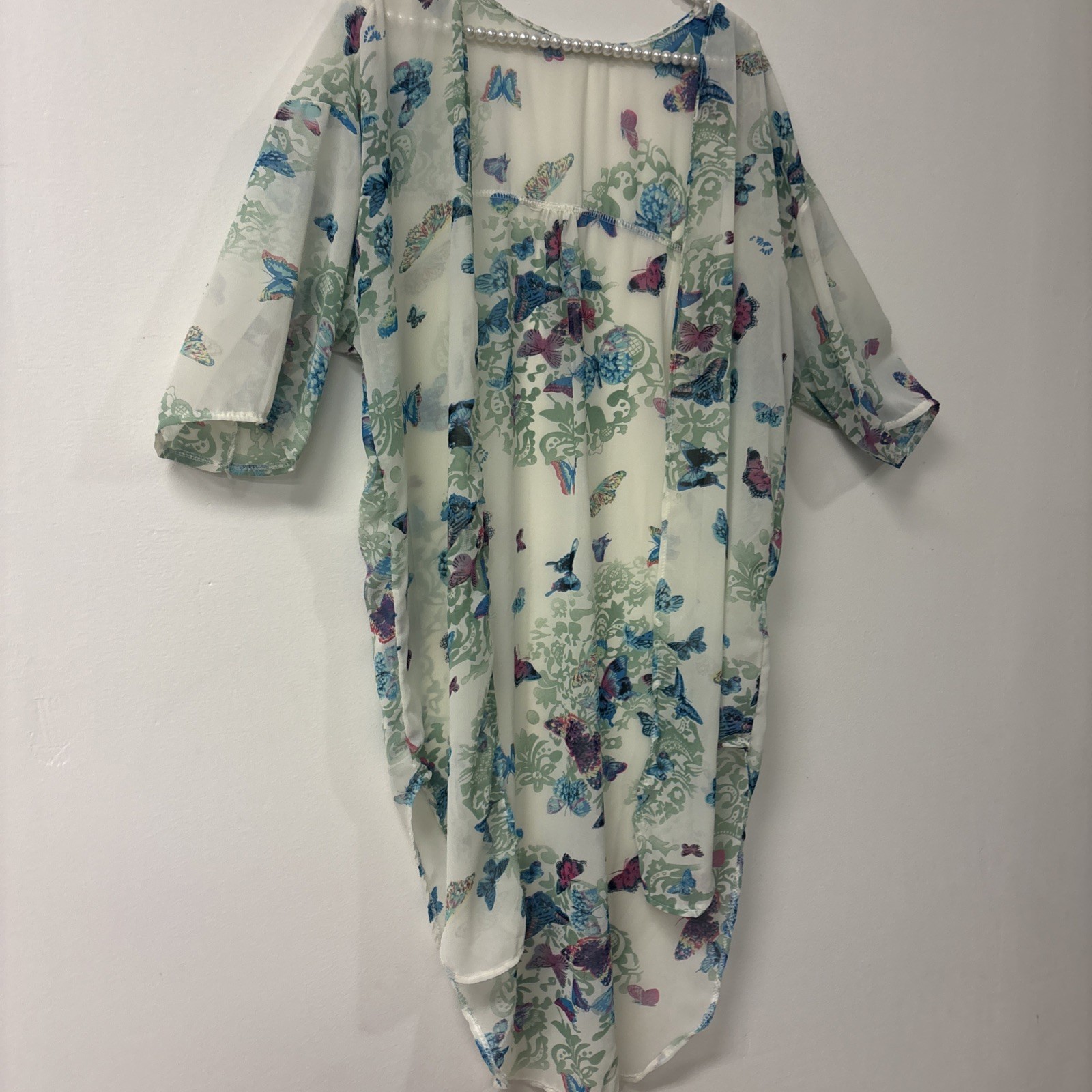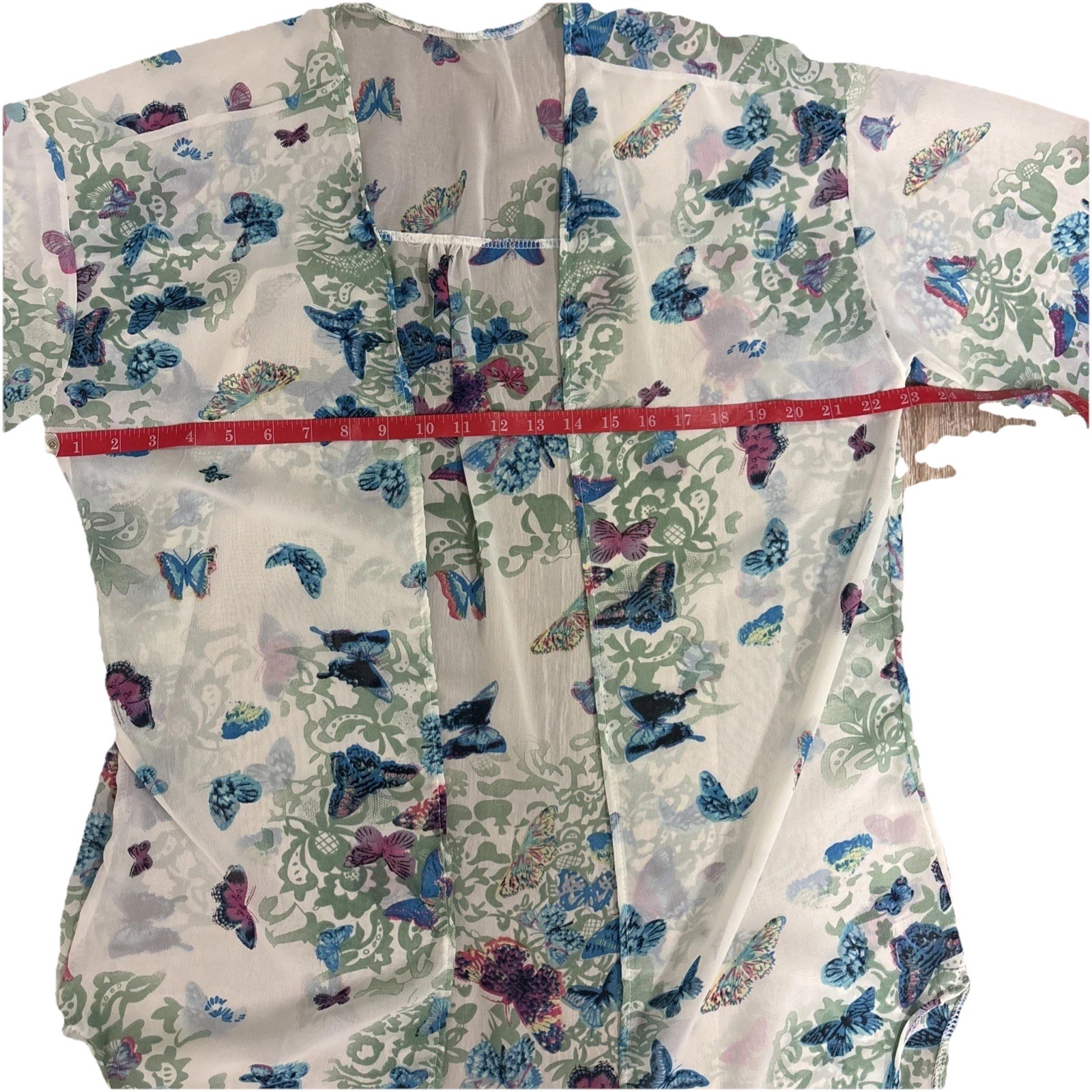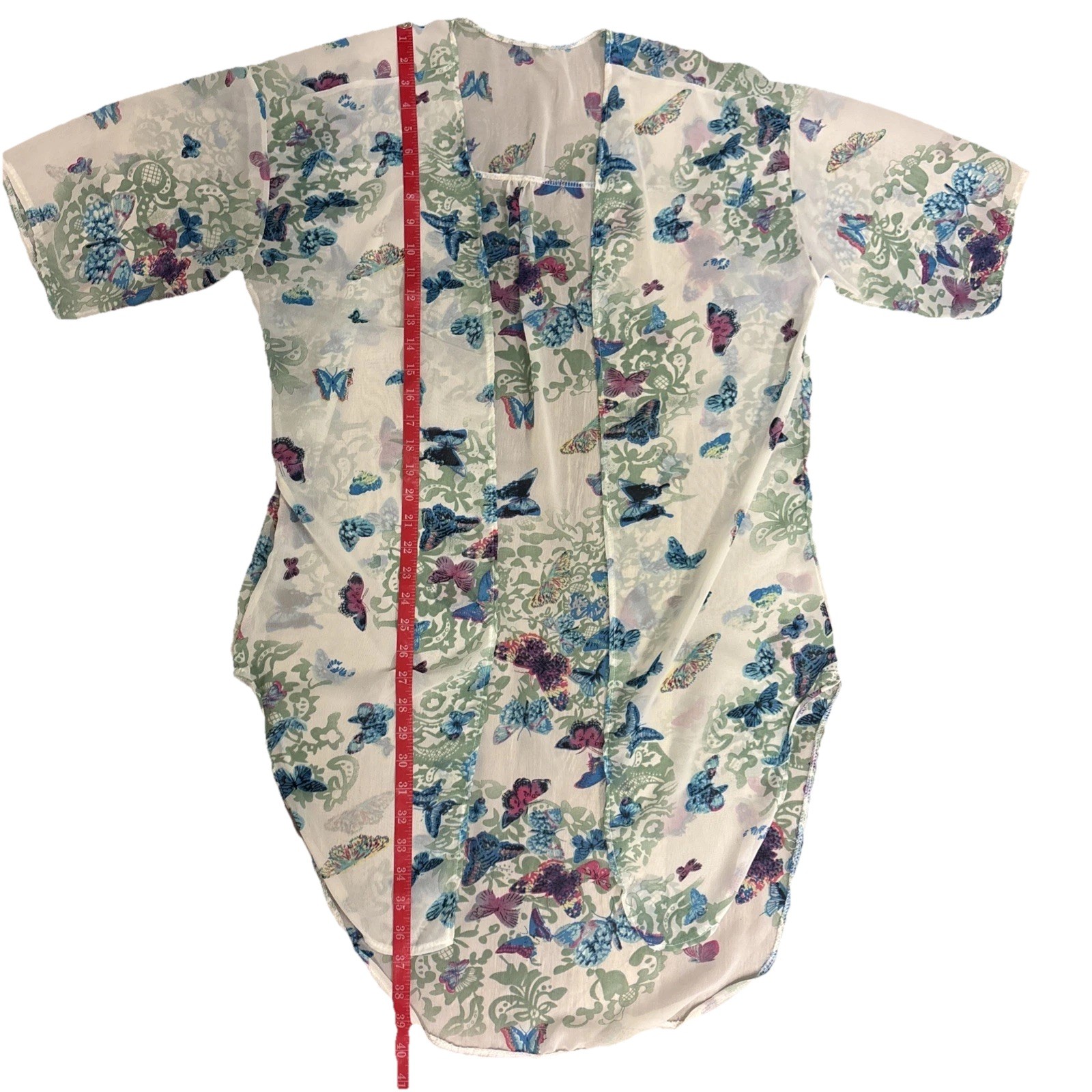 как выглядит Open Front Kimono Cardigan Blue Sheer 3/4 Sleeves Ruffles Butterfly Sz Med Long фото
