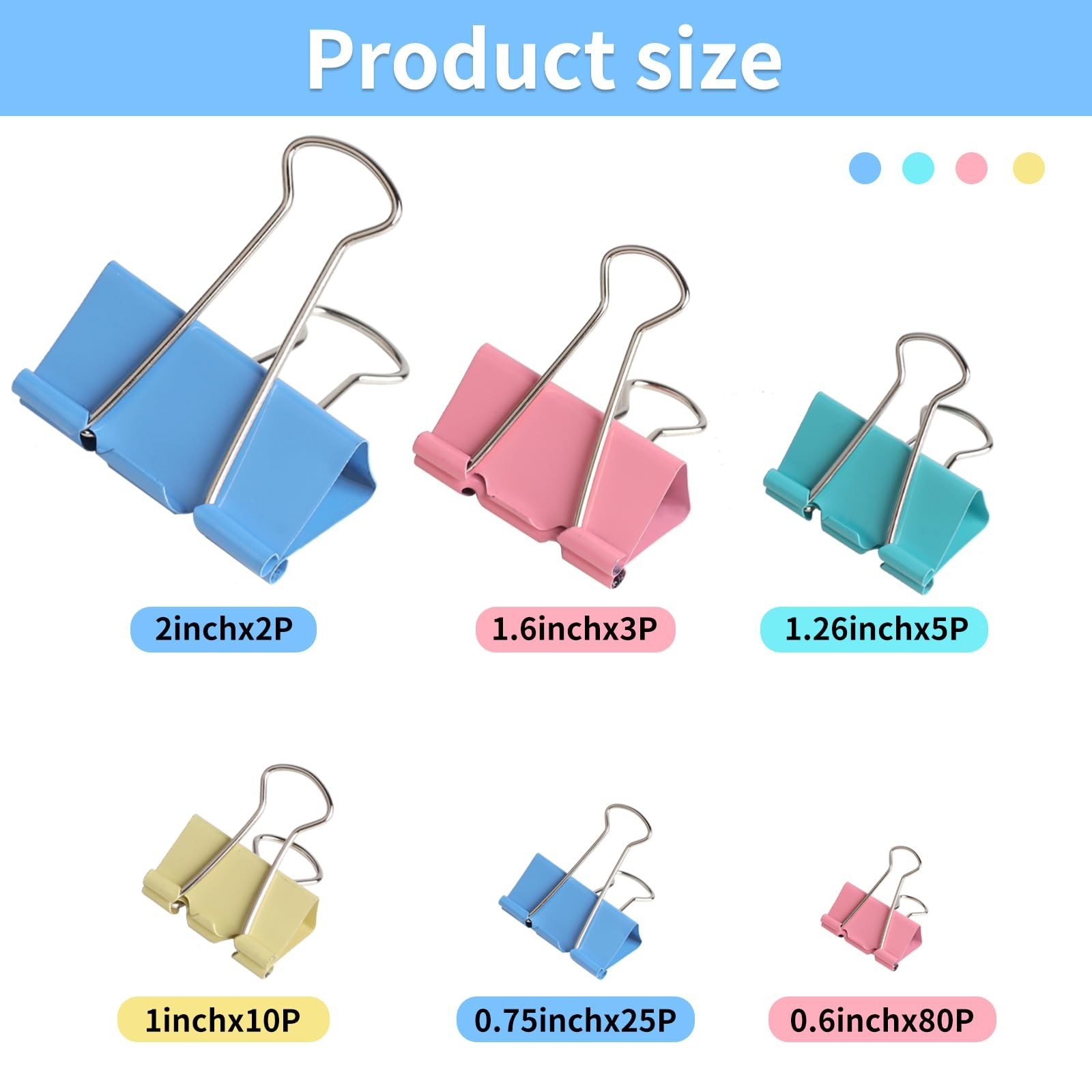 125Pcs Binder Clips Colored, Binder Clips Assorted Sizes, 6 Sizes Binder Paper