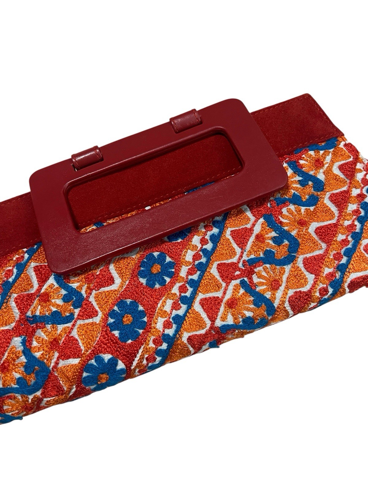 Crewel Embroidered Suede Floral Wood Handle Boho Hippie Art To Wear Clutch Purse