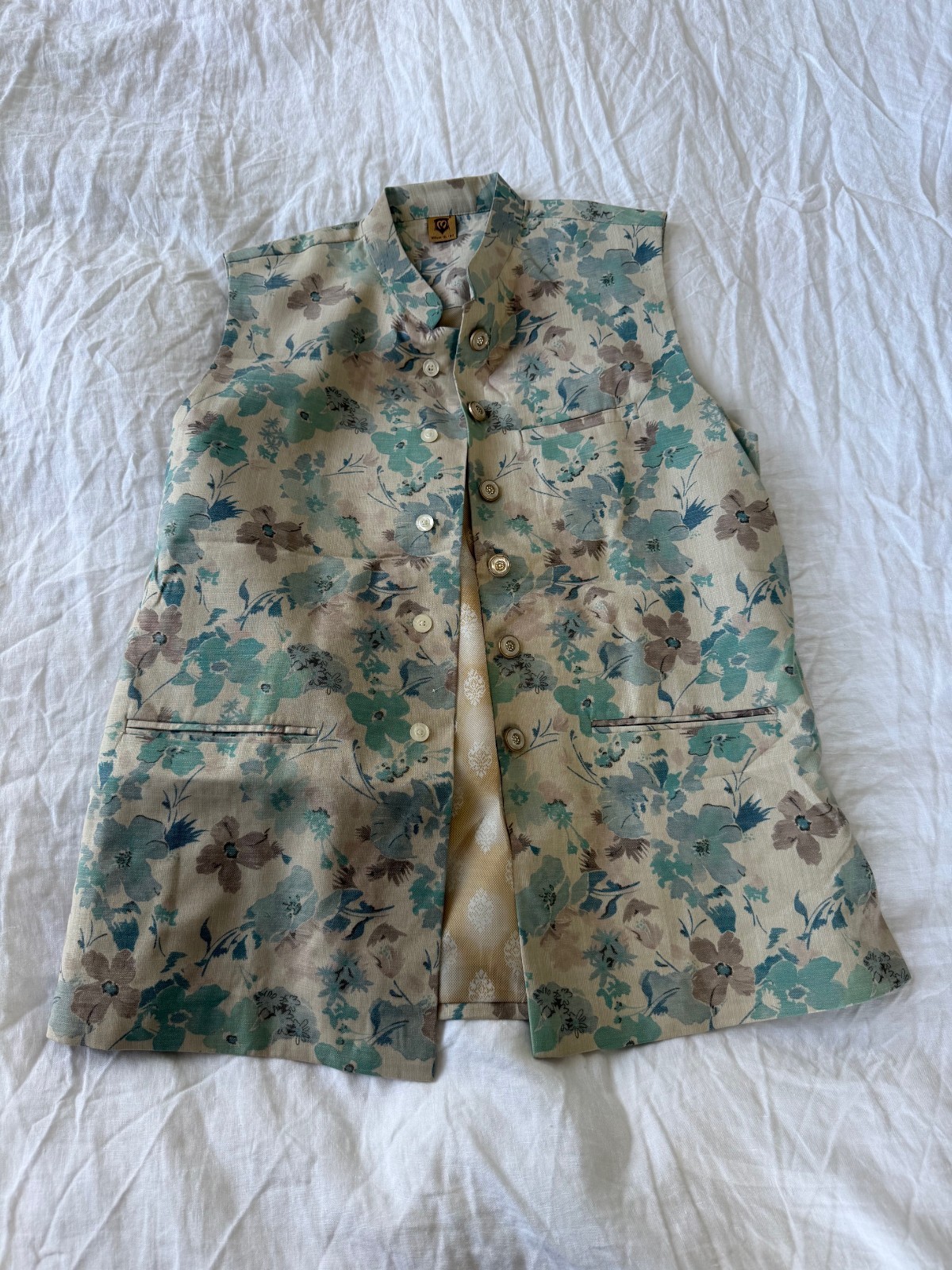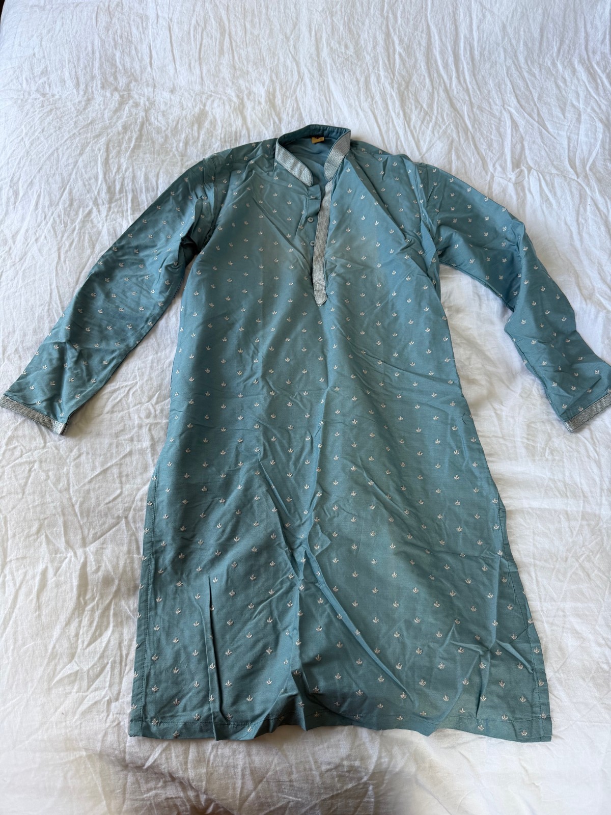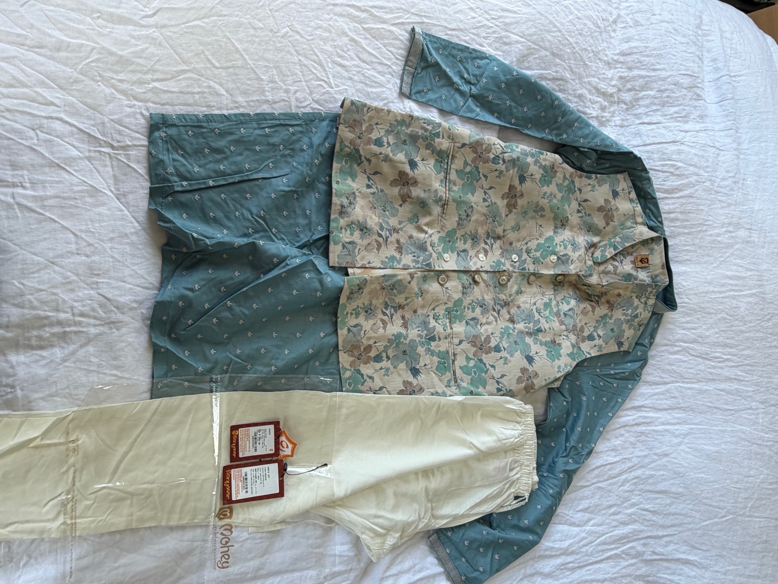 как выглядит Manyavar Kurta Pajama Vest Set - Indian Wedding - Light Blue Floral - Mens  XL фото
