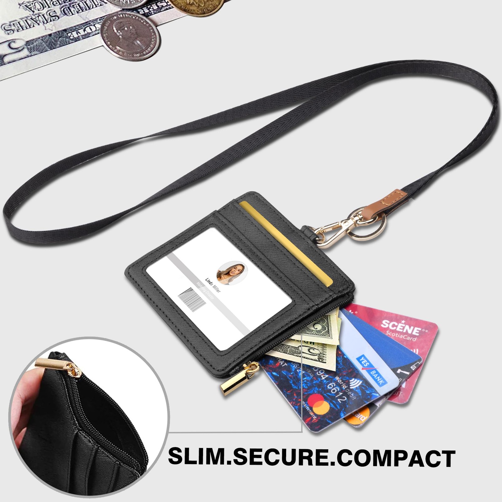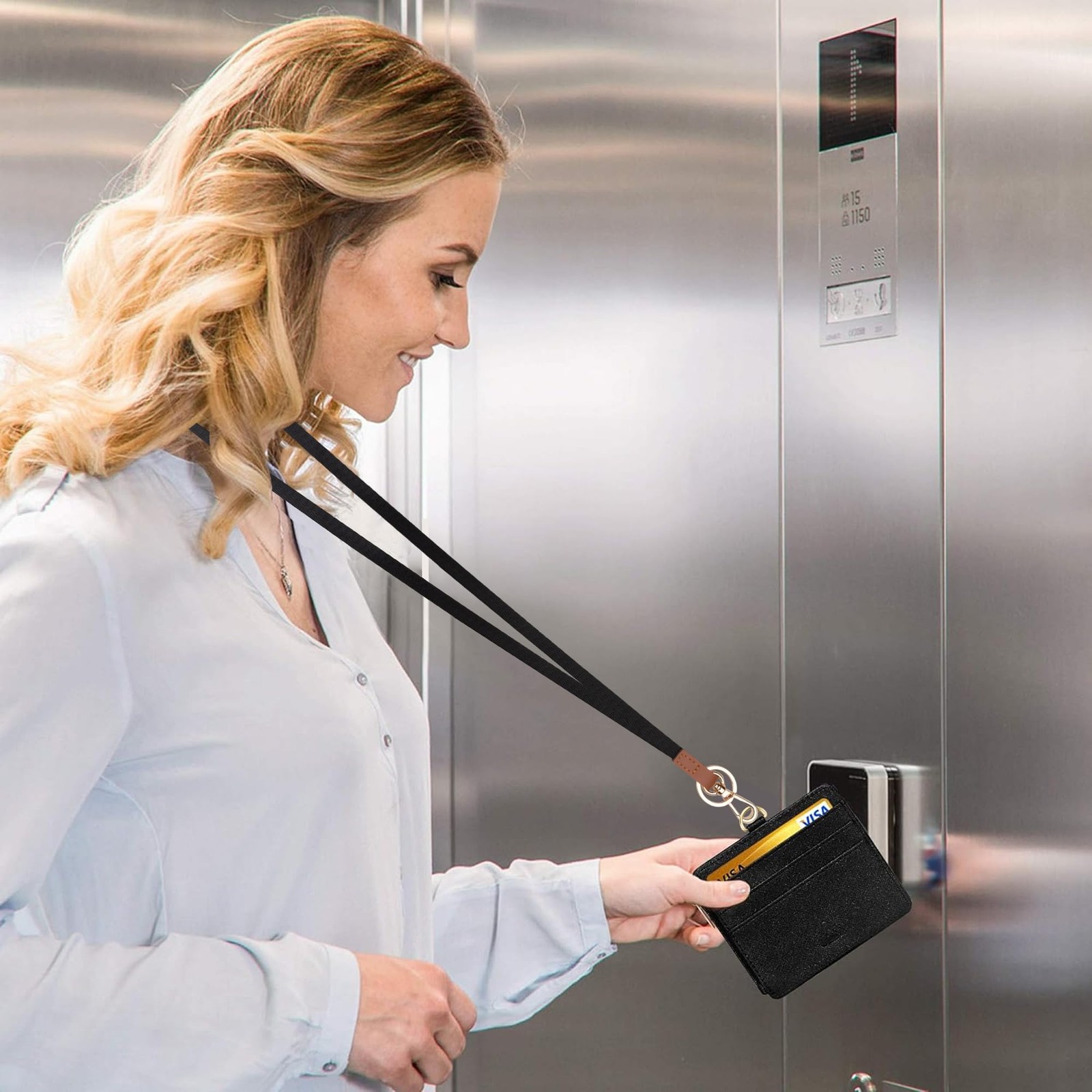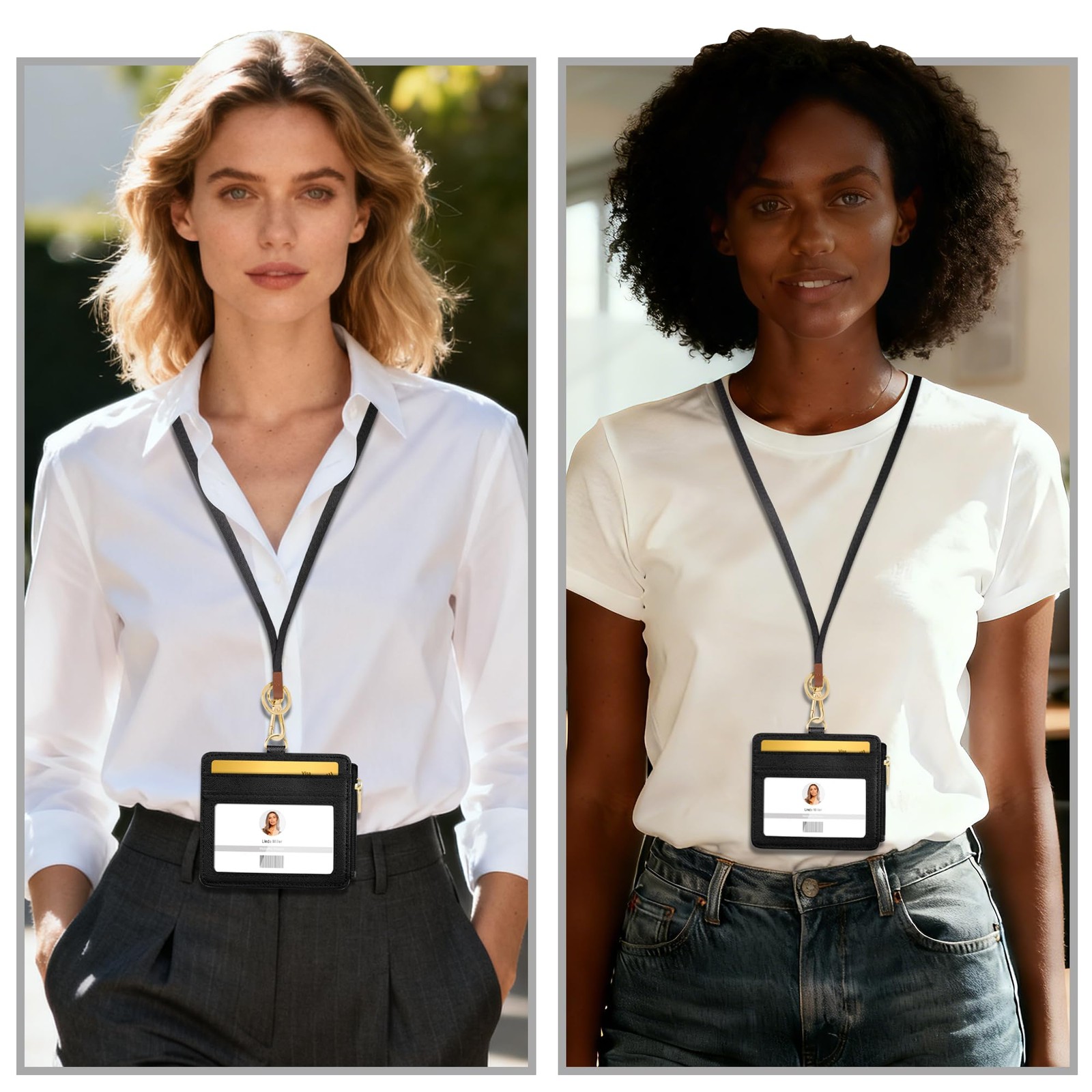 ID Badge Holder with Lanyard, Horizontal PU Leather - Black
