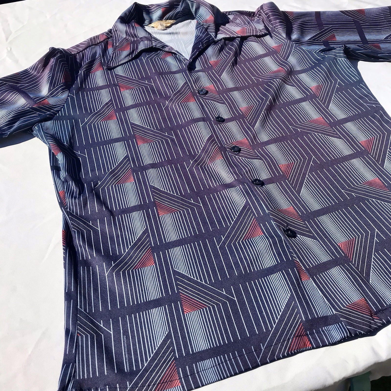Vtg 70s Styled in California Button Up Poly Shirt Men s S M Blue Disco Geo Retro