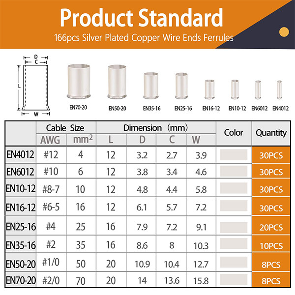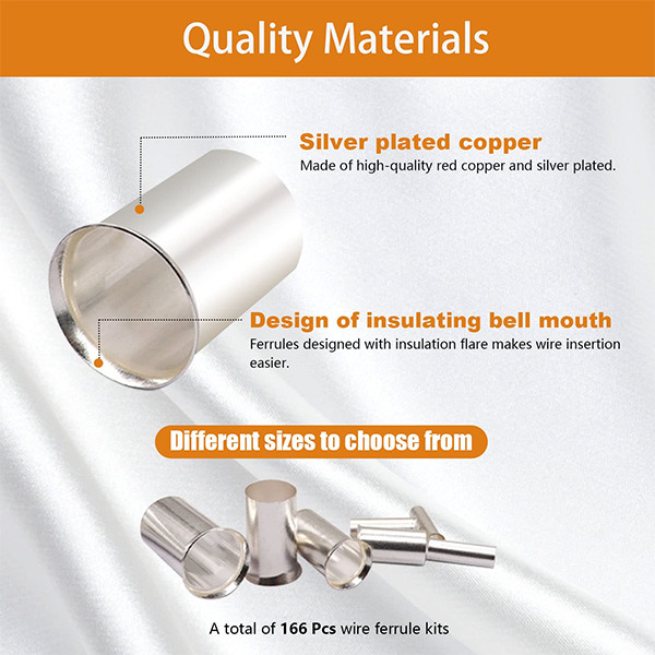 166pcs Wire Ferrules Kits Awg1/0 2/0 2 4 6 8 10 12 Silver Plated Copper Crimp