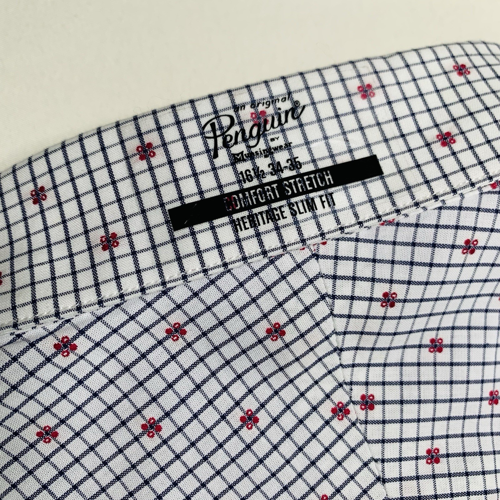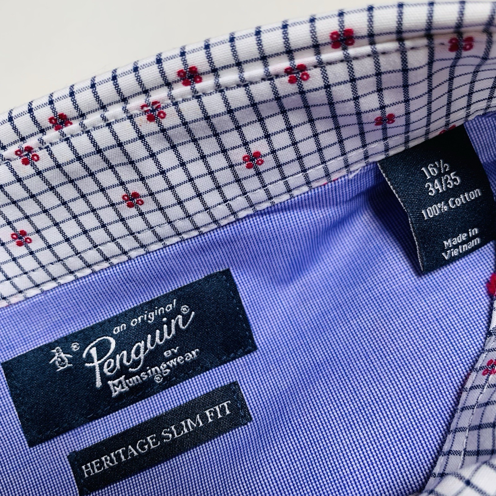Penguin Button Down Shirt Mens L 16.5 34/35 Heritage Slim Fit White/Blue Check