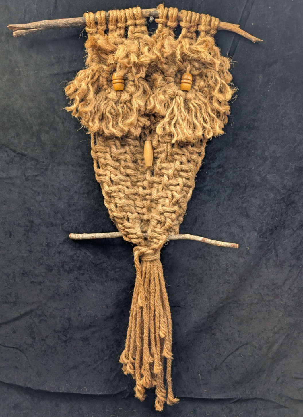 Vintage 1970s Macrame Owl Wall Hanging Jute Rope Boho Rustic Decor 34" Orange