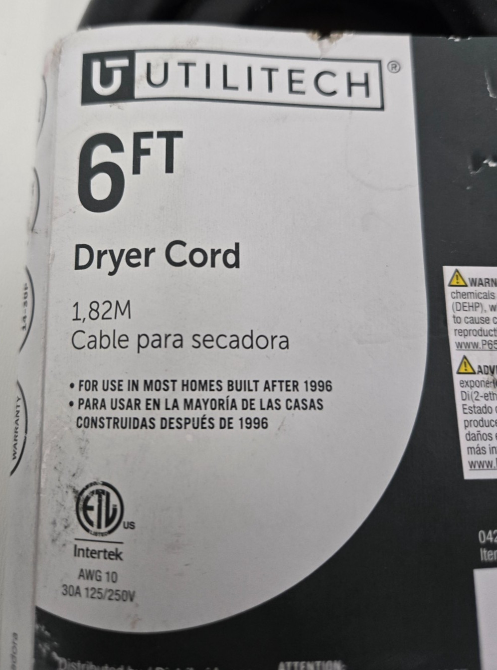 как выглядит Utilitech Dryer Cord 6 ft 4 Prong Plug 10/4 Gauge 30 AMP 0333552 New фото