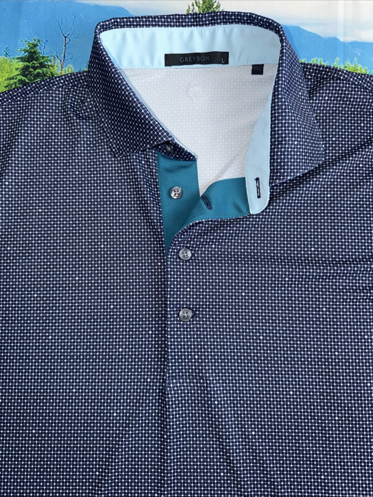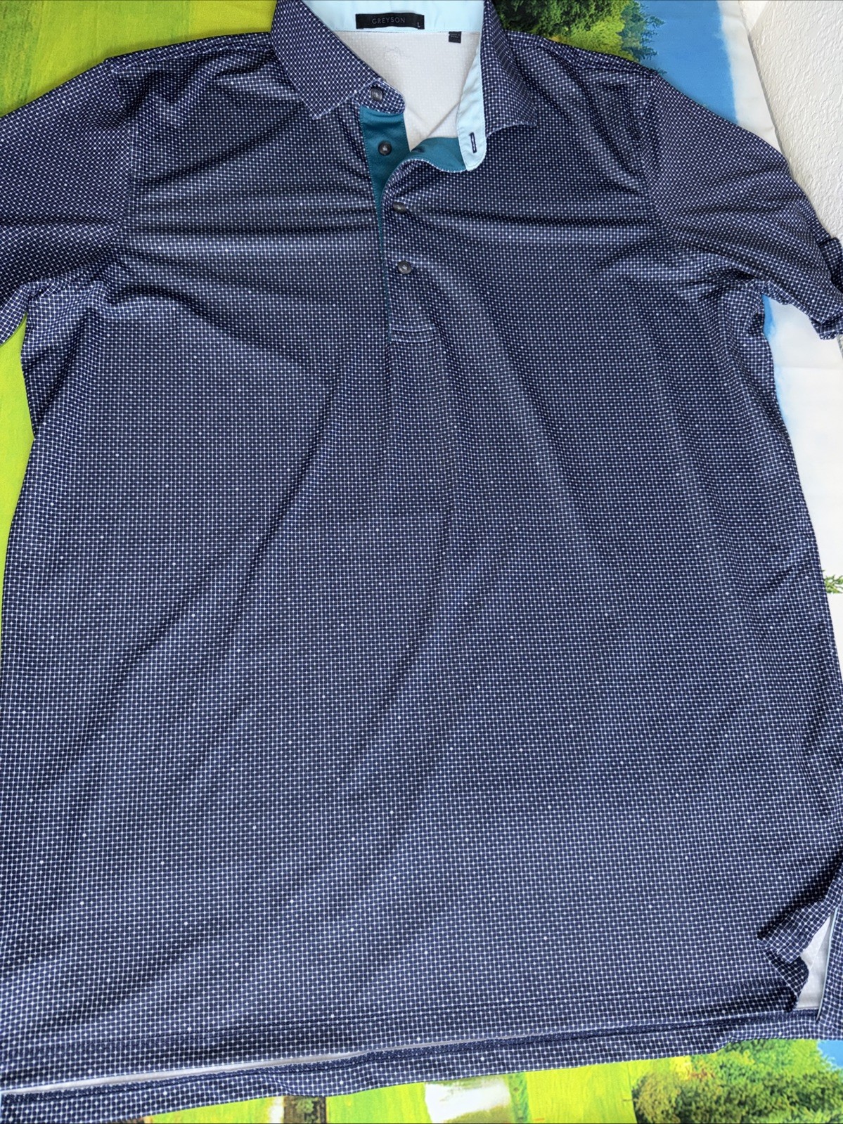 как выглядит Greyson Polo Shirt Mens L Blue Micro Print Stretch Performance фото